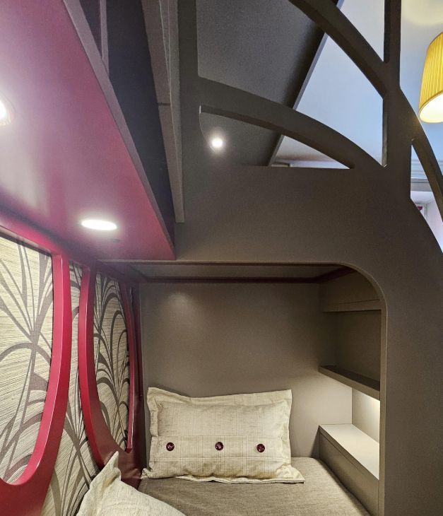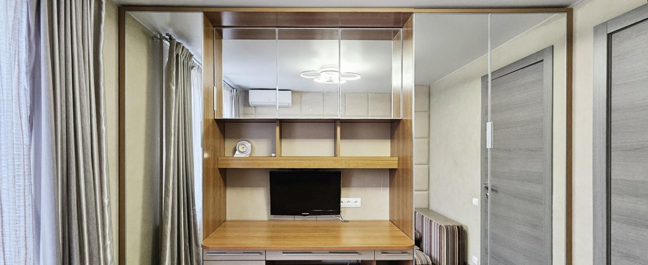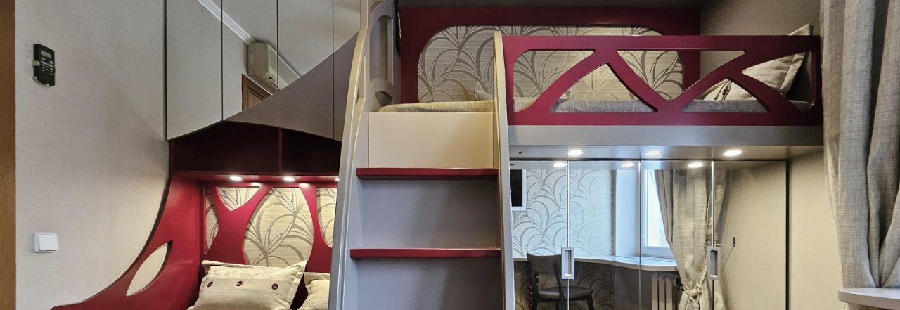 Детская комната тоже по индивидуальному проекту, с двумя кроватями в разных уровнях, интегрированным зеркальным шкафом, полочками, нишами и выдвижными ящиками. Письменный стол выполнен, как продолжение подоконника.