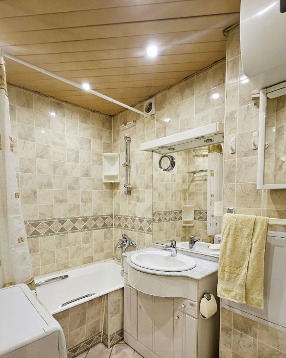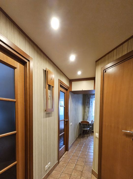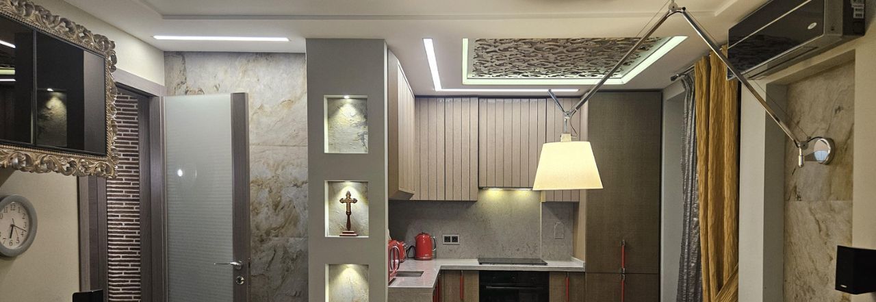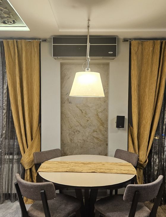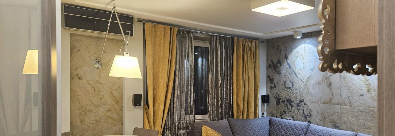 Стильные интерьеры общей зоны, объединенная кухня-гостиная располагают к комфортному отдыху всей семьи. Стол раскладывается на 6 человек. Широкий, мягкий диван, большой телевизор, акустика на 6 каналов. При этом в квартире есть еще три изолированные спальни и можно, при необходимости, оборудовать четвертую.