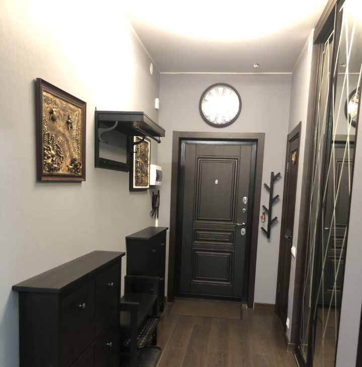• В прихожей встроенный шкаф-купе с большим зеркалом, обувницы, системы для хранения вещей, а также гостевой туалет.