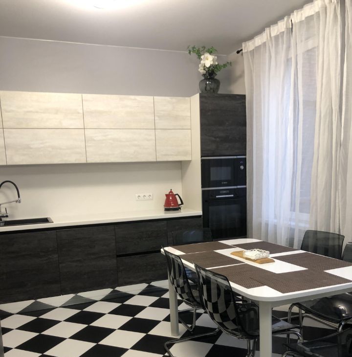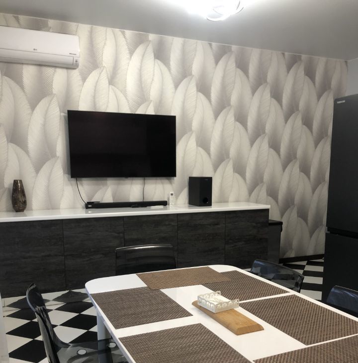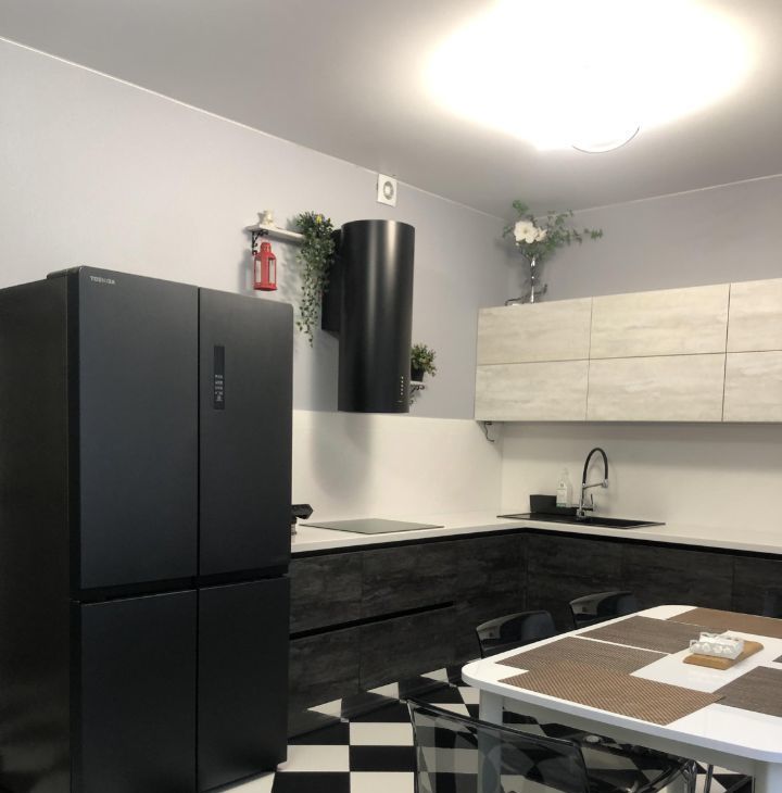 • Кухня-столовая 22м2, полностью оборудованная всем необходимым (индукционная варочная панель, встроенные в фасады микроволновка, духовка и посудомойка фирмы Bosch, огромный двустворчатый холодильник Toshiba, 55-дюймовый 4К телевизор, также установлена система фильтрации водопроводной воды с обратным осмосом (можно пить воду из крана))