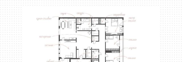 Планировка: кухня-гостиная, гостиная, 4 спальни, кабинет, 4 санузла, 2 гардеробные, подсобные помещения, холл. Из двух спален предусмотрен выход на общую лоджию. Окна ориентированы на две стороны света.