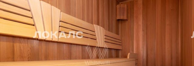 Квартира полностью меблирована, в гостиной обустроена зона отдыха с камином и домашним кинотеатром. Кухня со встроенной бытовой техникой отделана натуральным камнем. В одной из ванных комнат спланирована сауна, санузлы отделаны керамогранитом.