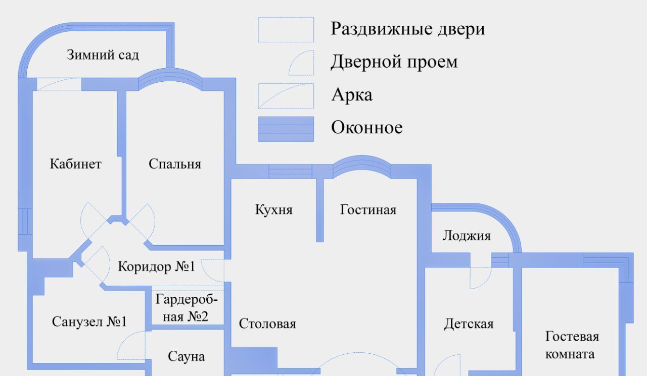 Взрослая/родительская зона это основная спальня, рабочий кабинет, зимний сад, вторая гардеробная и санузел с джакузи и отдельной сауной.
