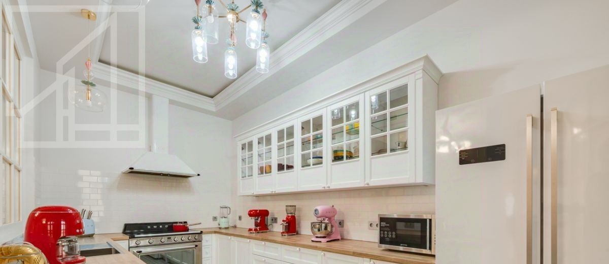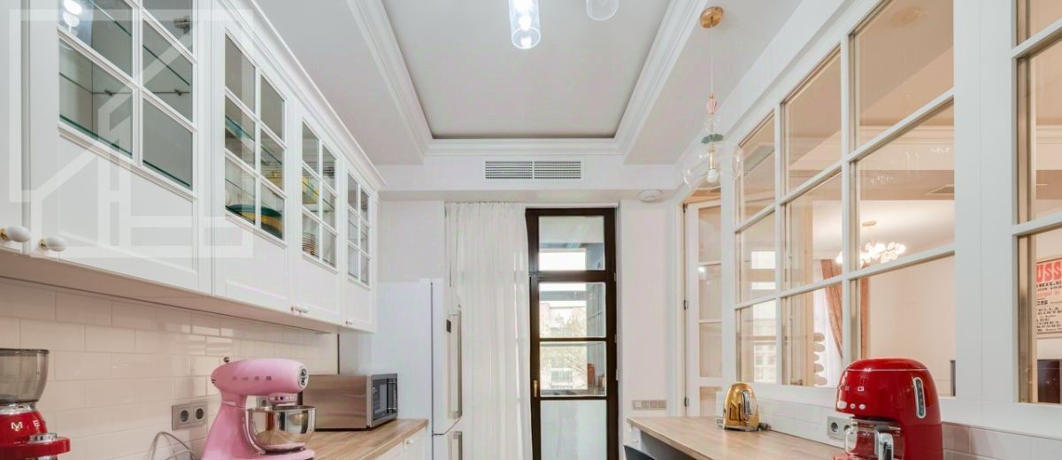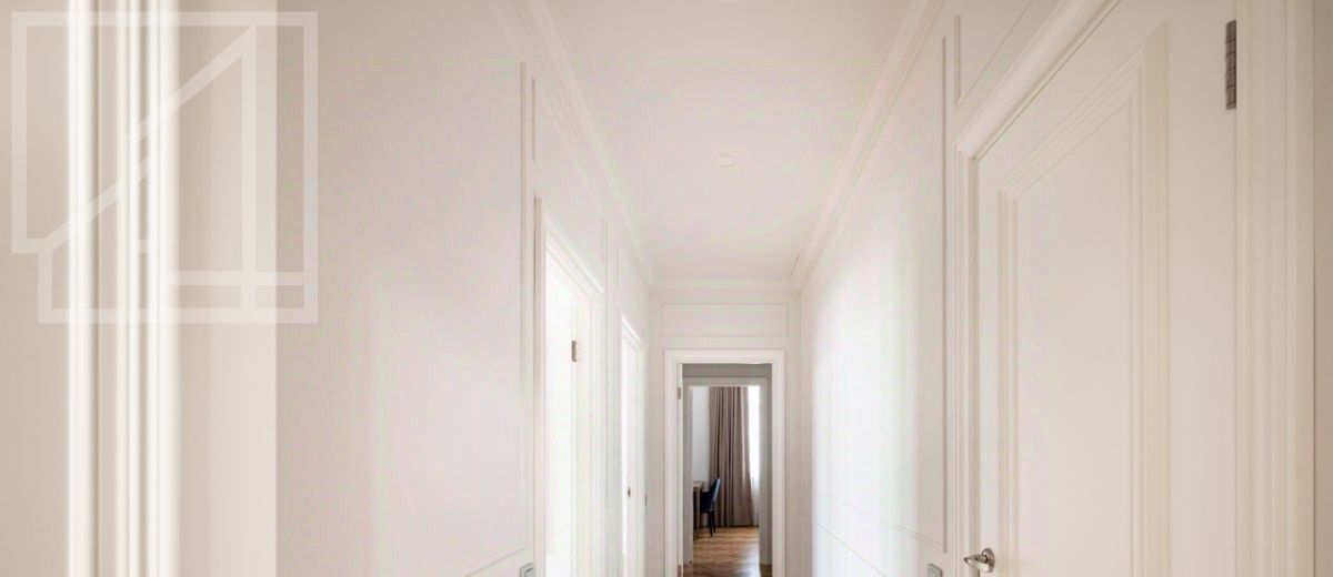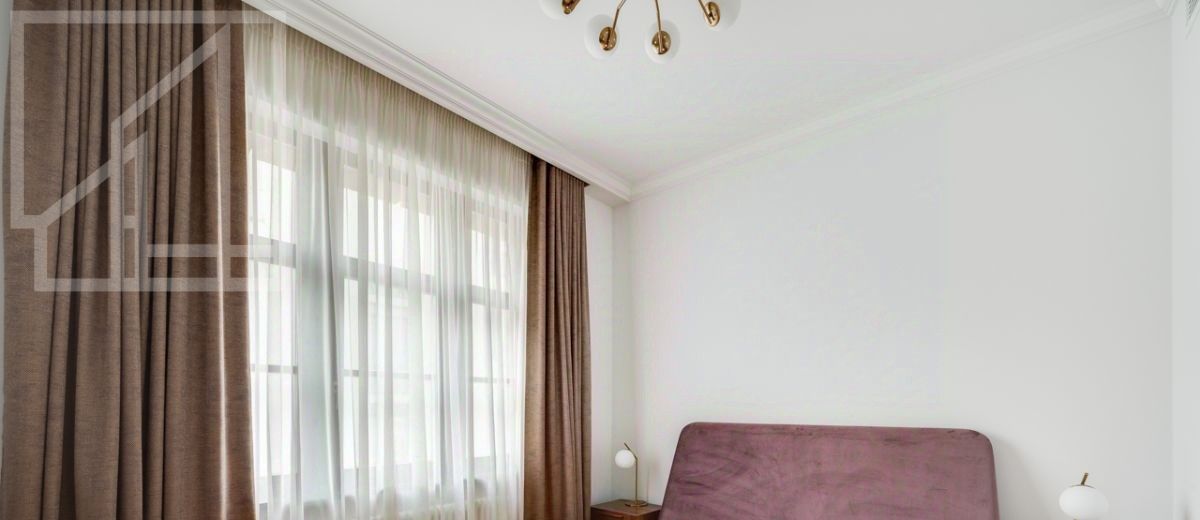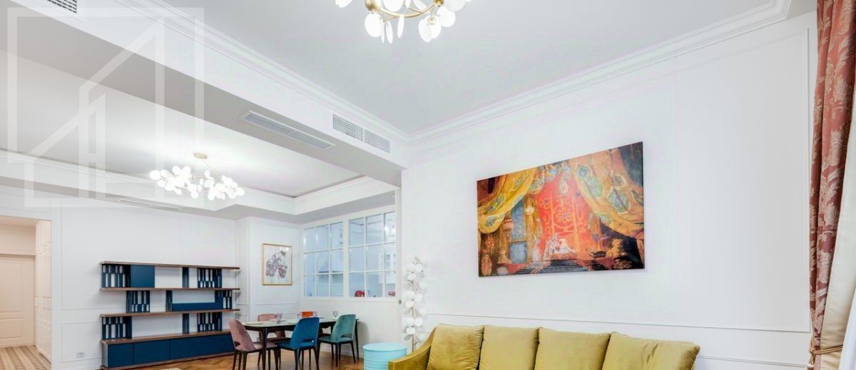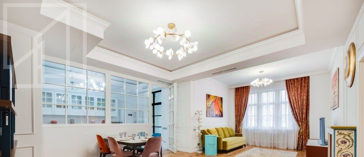 Планировка: гостиная с обеденной зоной, кухня, мастер-спальня с гардеробной и санузлом, детская со смежной комнатой-спальней, детская, санузел с ванной, гостевой санузел с душем, гардеробная при входе. Окна выходят во двор. В квартире выполнен авторский ремонт в светлых тонах. Квартира частично меблирована и оснащена всей необходимой техникой.
