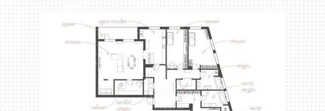 Планировка: гостиная, кухня-столовая, кабинет, мастер-спальня с ванной комнатой, две детские спальни с общей гардеробной и общей ванной комнатой, постирочная, гостевой санузел.