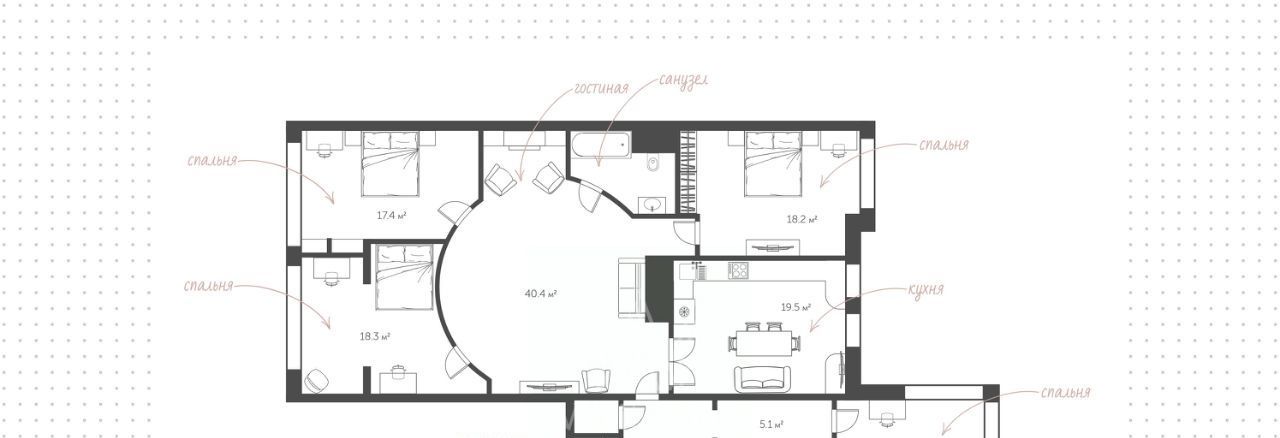 Спланирована гостиная с электрокамином, обособленная кухня с обеденной зоной, 4 спальни, ванная комната, санузел с душевой, гардеробная, постирочная, холл. Квартира полностью меблирована и оборудована бытовой техникой. Окна ориентированы на 2 стороны, открываются виды на улицу и в тихий двор. Предусмотрены 2 машино-места в подземном паркинге.