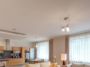 Большая гостиная совмещенная с кухней и столовой зоной - светлое пространство для приема гостей и семейных обедов. Оснащена встроенным кухонным гарнитуром премиум-класса.