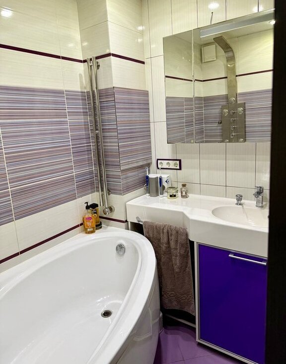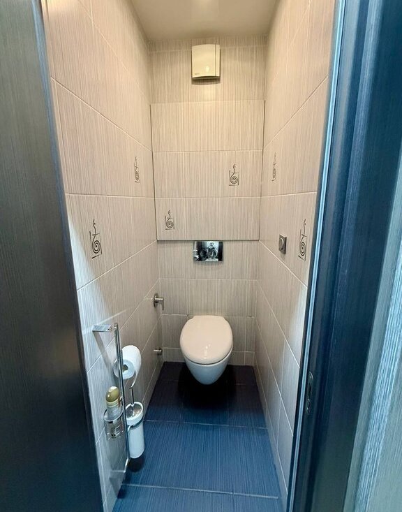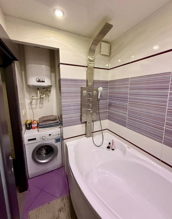 Ванная комната оборудована современной стиральной машиной. Установлена система контроля утечки воды. Раздельный санузел добавляет удобства в повседневной жизни.