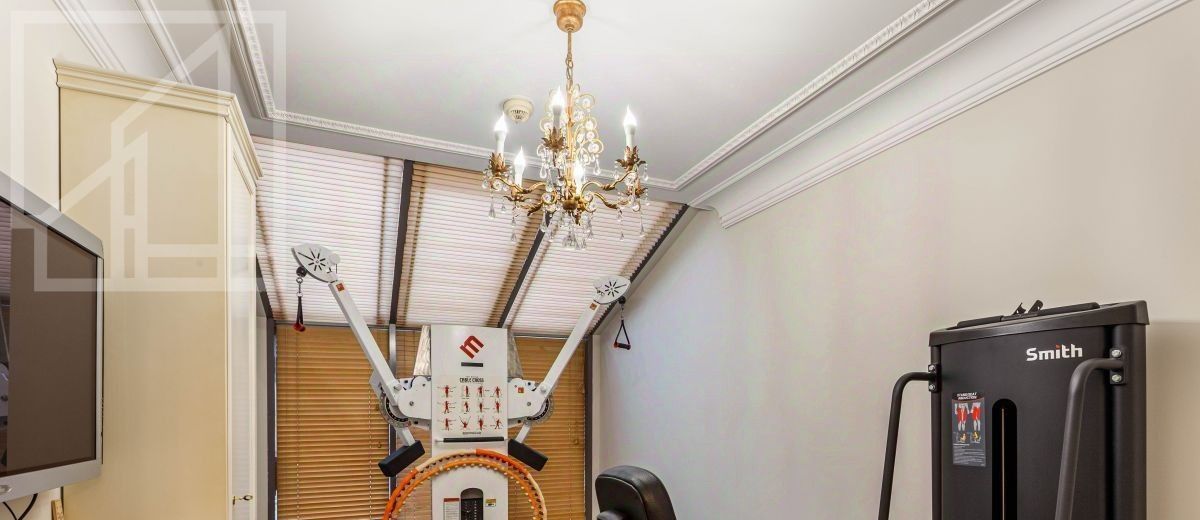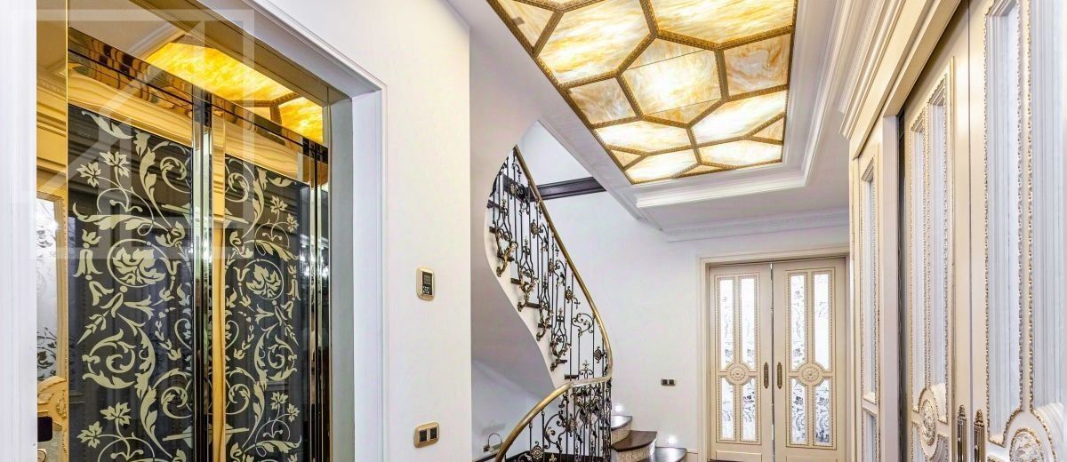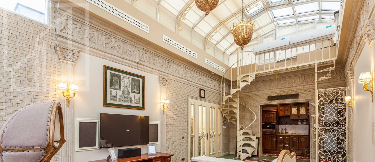 Планировка первого уровня: гостиная, два зимних сада, кухня, выход во внутренний двор; планировка второго уровня: две спальни, кабинет, гардеробная, ванная комната; планировка третьего уровня: две спальни со своими гардеробными и санузлами; на четвертом уровне расположена терраса; на цокольном этаже размещены бассейн, сауна, хаммам, два санузла, гардеробная, три кладовых. Бытовая техника от ведущих производителей, эксклюзивная мебель.