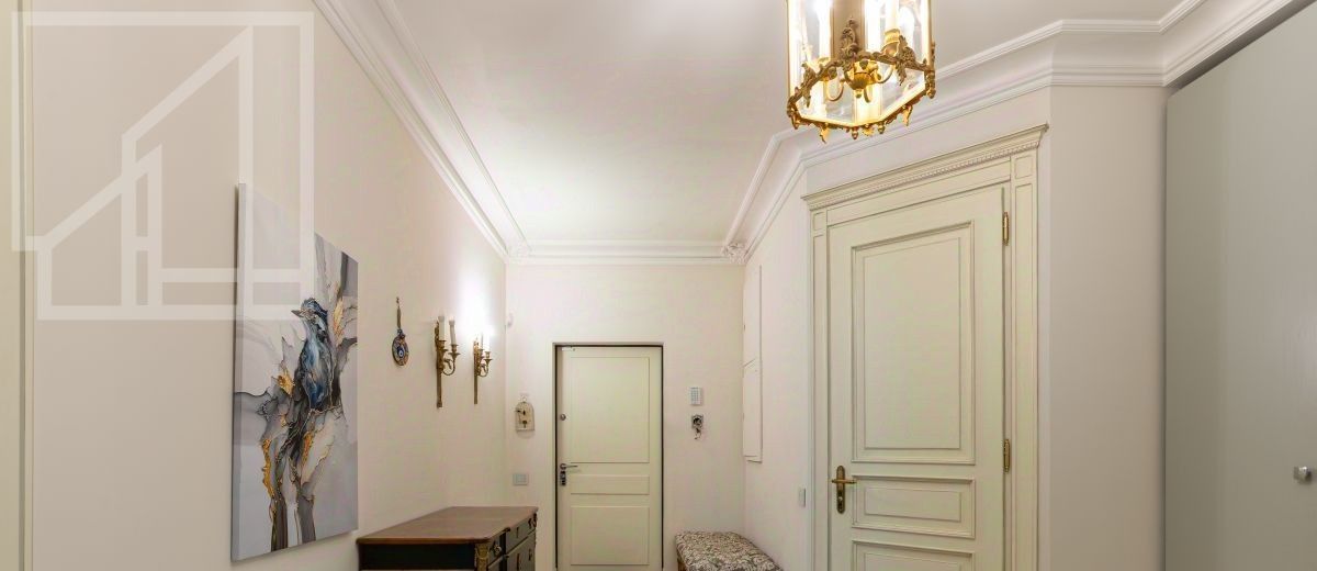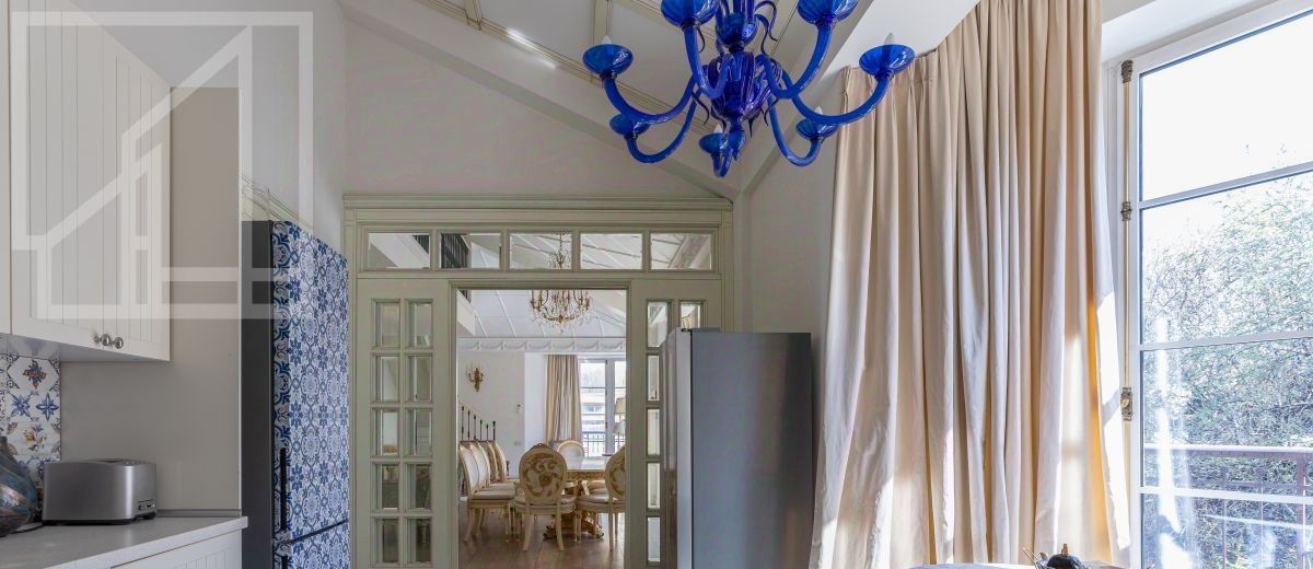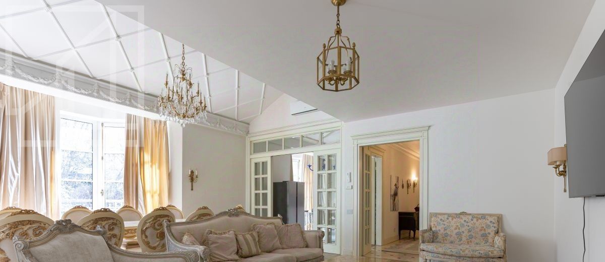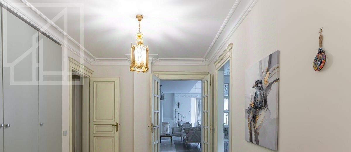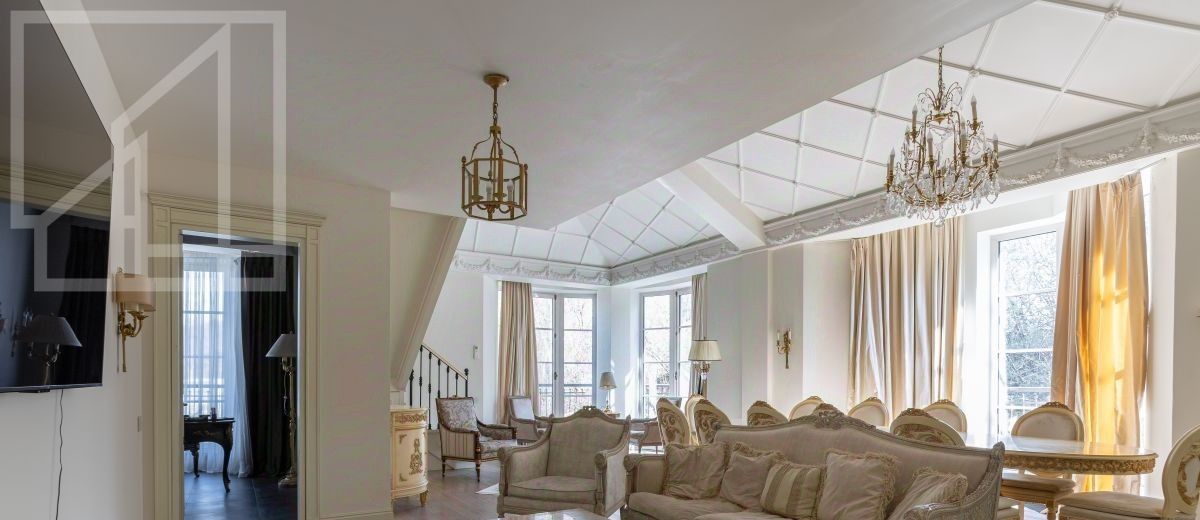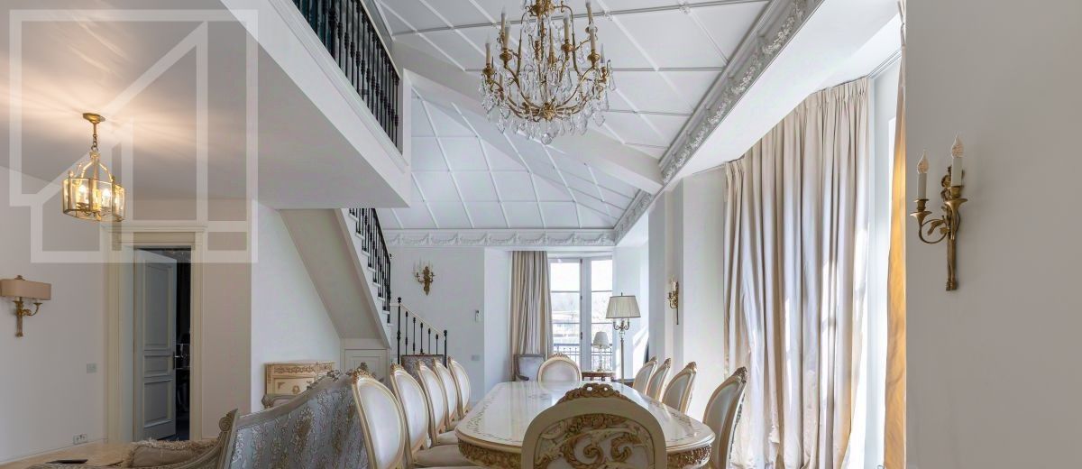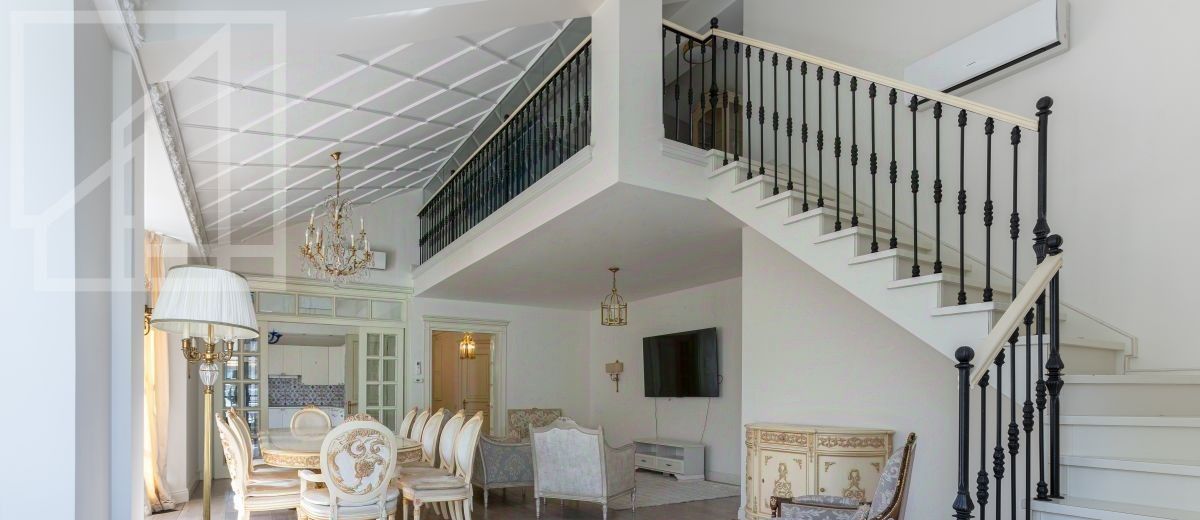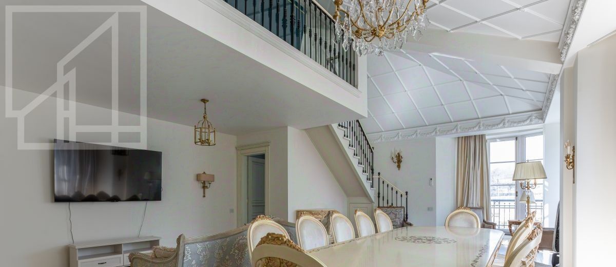 Второй уровень: дополнительная гостиная, большая гардеробная, комната свободного назначения и санузел. В квартире высокие потолки (более 4 метров) и большие панорамные окна, выходящие на тихий зелёный двор с раскидистыми деревьями, что создает ощущение простора и света.