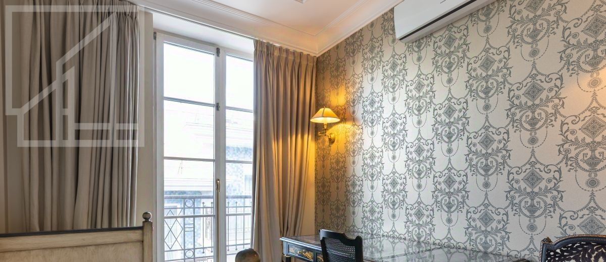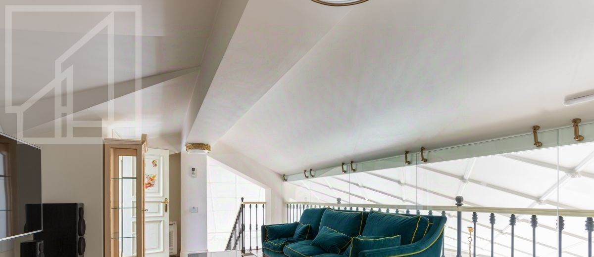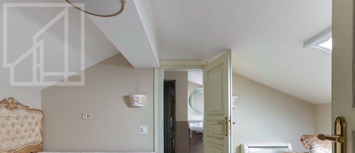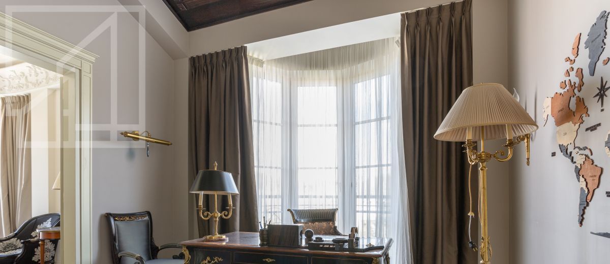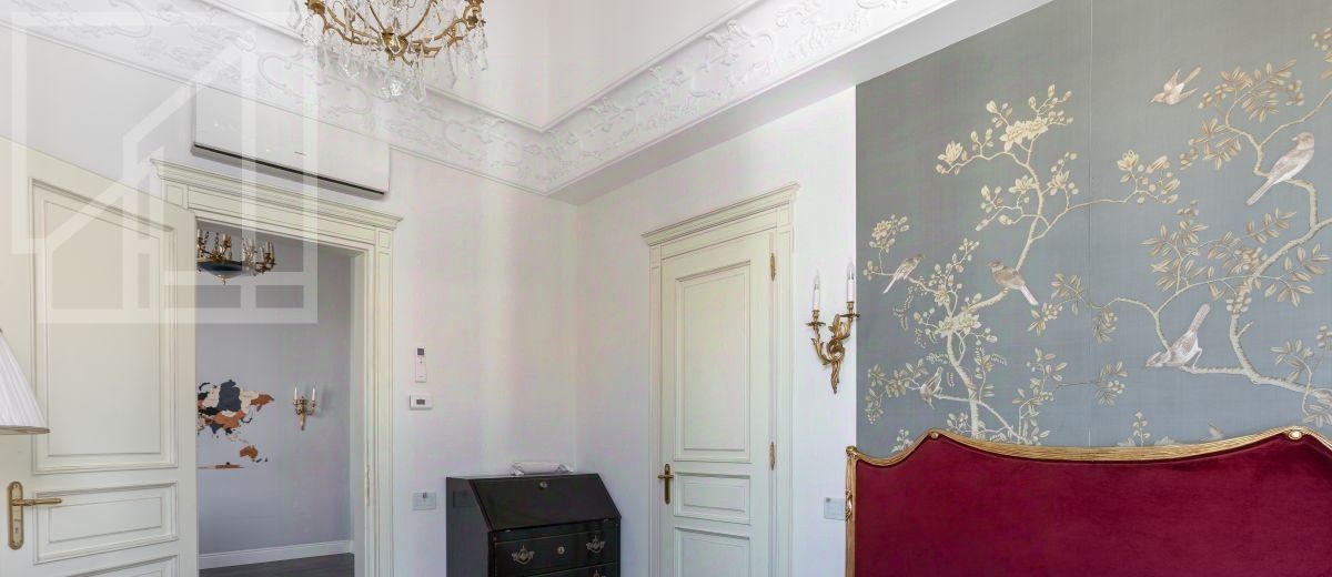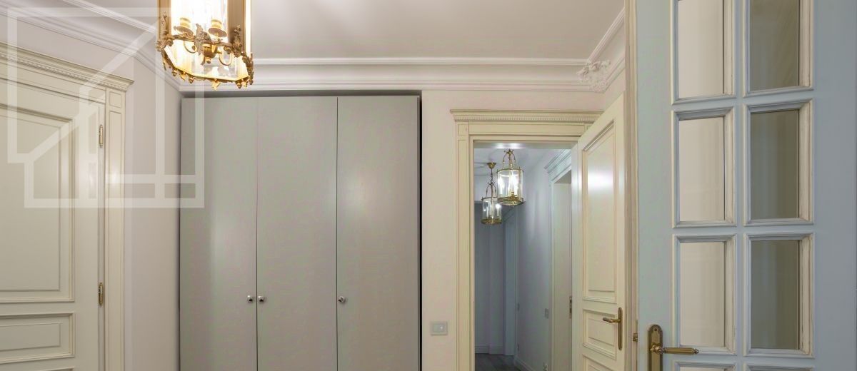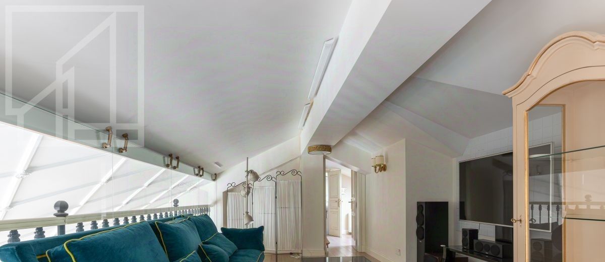 Второй уровень: дополнительная гостиная, большая гардеробная, комната свободного назначения и санузел. В квартире высокие потолки (более 4 метров) и большие панорамные окна, выходящие на тихий зелёный двор с раскидистыми деревьями, что создает ощущение простора и света.