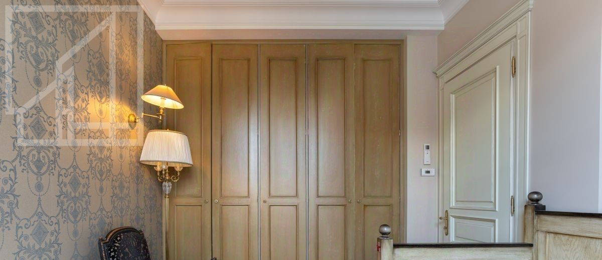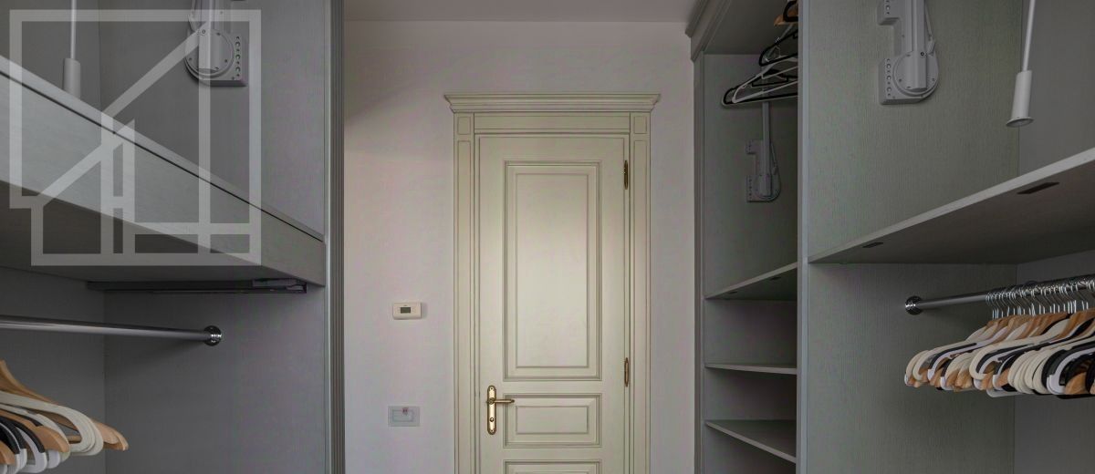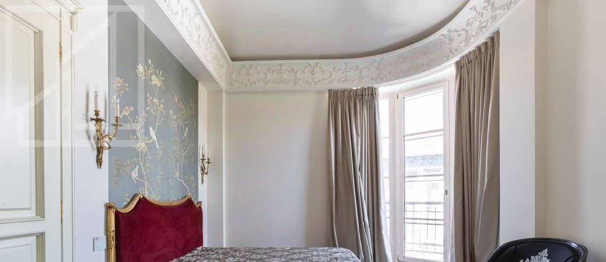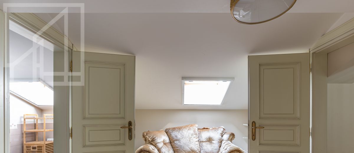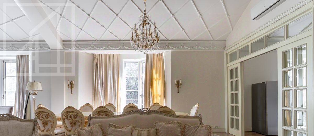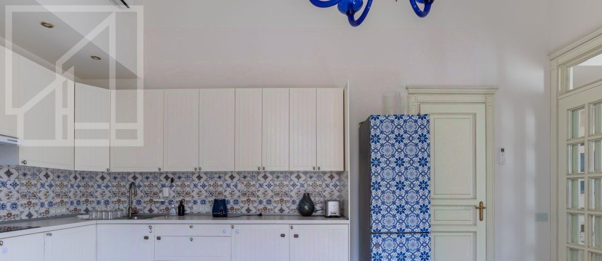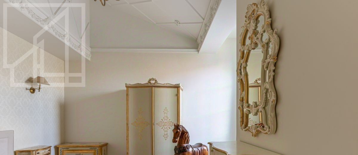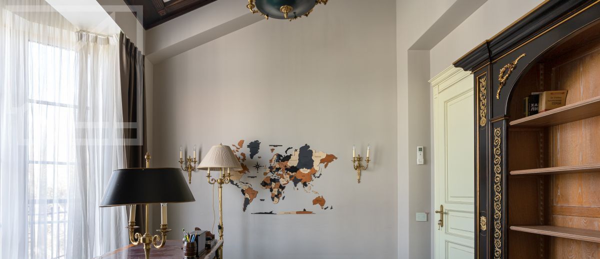 Второй уровень: дополнительная гостиная, большая гардеробная, комната свободного назначения и санузел. В квартире высокие потолки (более 4 метров) и большие панорамные окна, выходящие на тихий зелёный двор с раскидистыми деревьями, что создает ощущение простора и света.