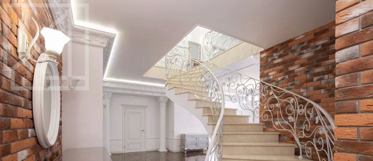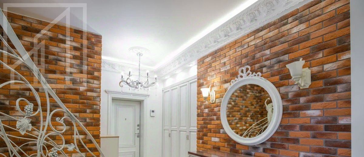 Планировка: 1-й этаж: кухня-гостиная с обеденной зоной, изолированная спальня, совмещенный санузел с душевой кабиной, постирочная; 2-й этаж: гостиная, три изолированные спальни, большая гардеробная, два совмещенных санузла с ванной и душевой кабиной. Квартира укомплектована классической мебелью и современной техникой. Из окон открывается вид на город. В отделке использовано натуральное дерево, белая лепнина, декоративный кирпич. Высота потолков 3 метра.
