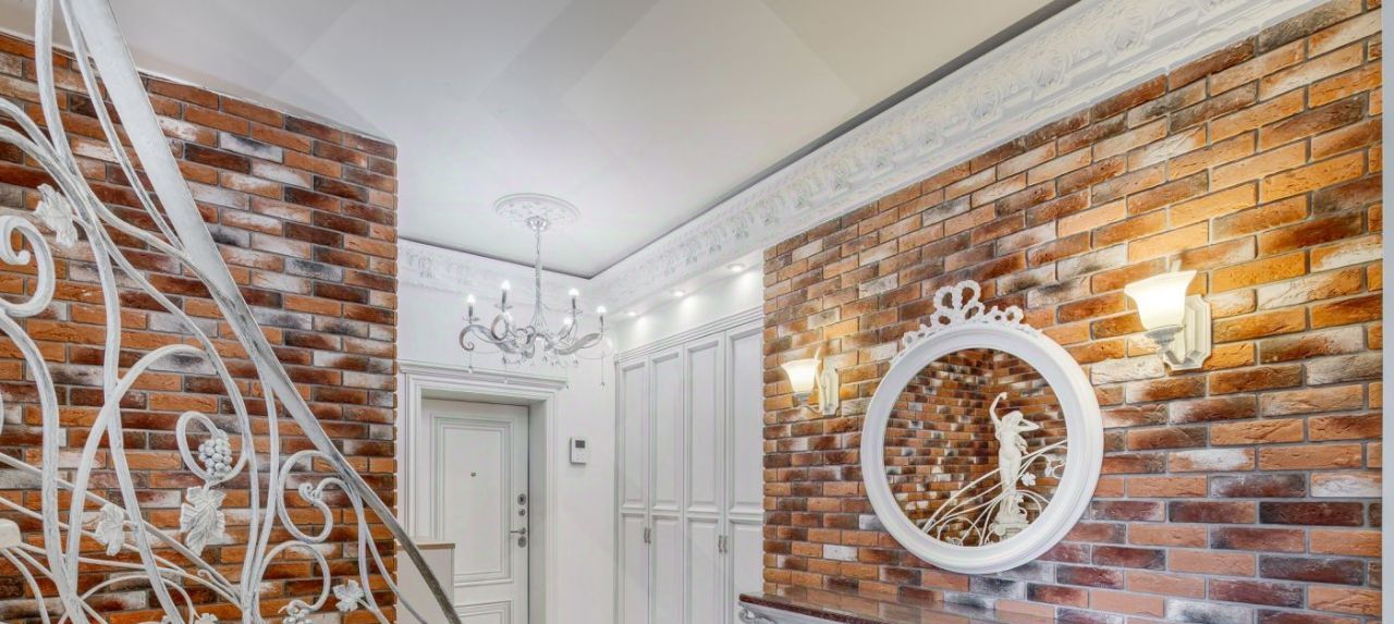 Ключевые черты интерьера - сочетание фактур: теплое натуральное дерево, изящная белая лепнина и стильный декоративный кирпич.
