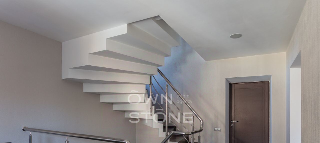 Цокольный этаж включает в себя гараж на 2 машиноместа и бытовую комнату. 1-й этаж встроенная кухня со всей необходимой бытовой техникой, гостевой с/у, гостиная с действующим камином. На 2-м этаже 3 комнаты, балкон, гардеробная и с/у. 3-й этаж 3 спальни, 2 с/у, балкон.
