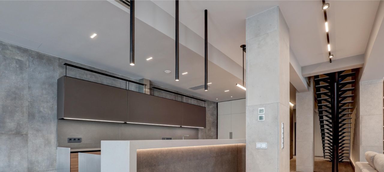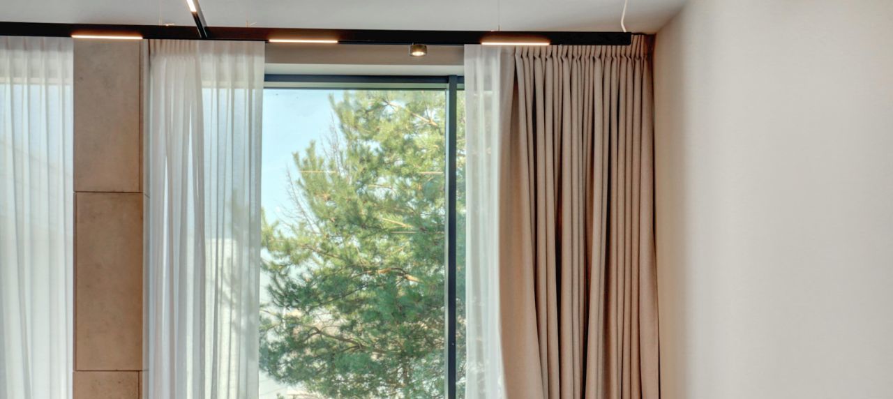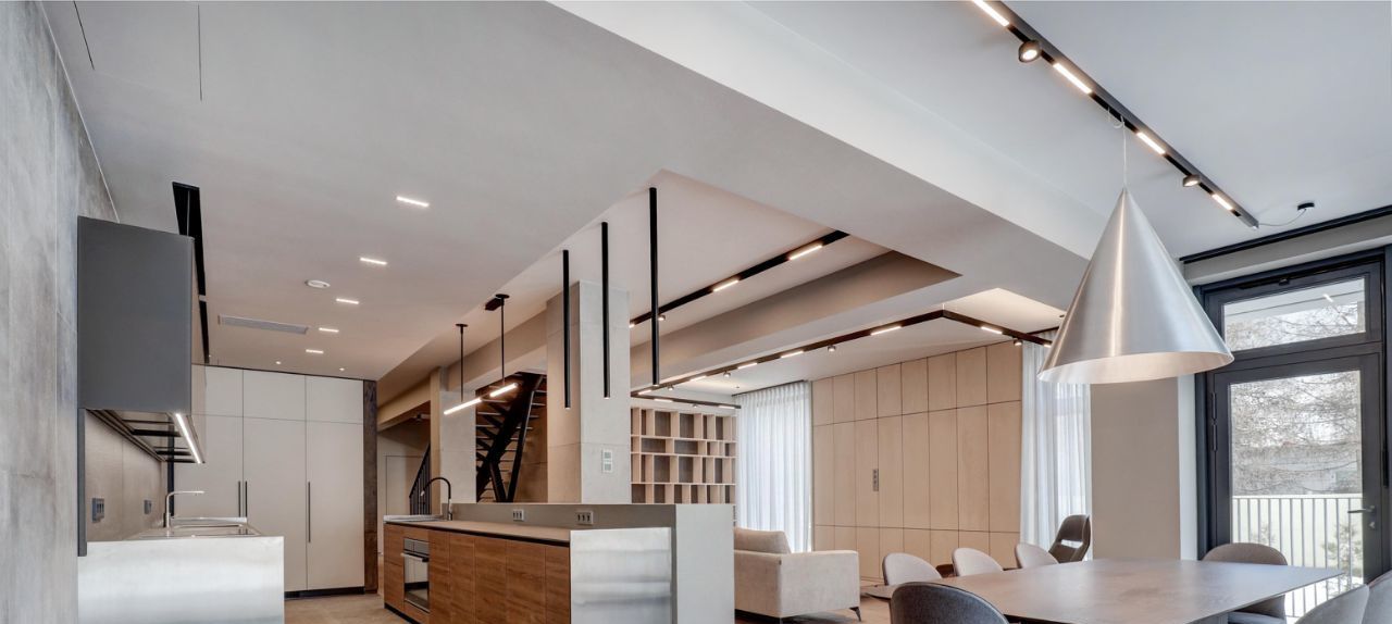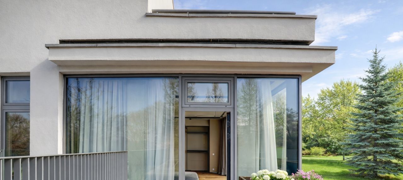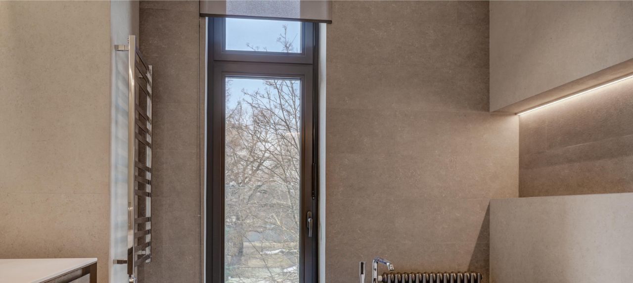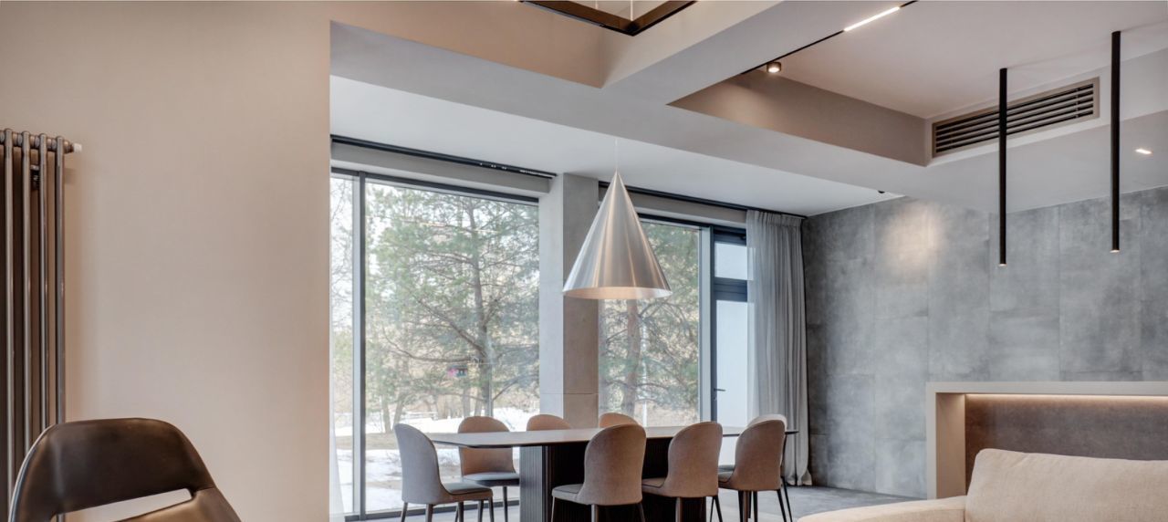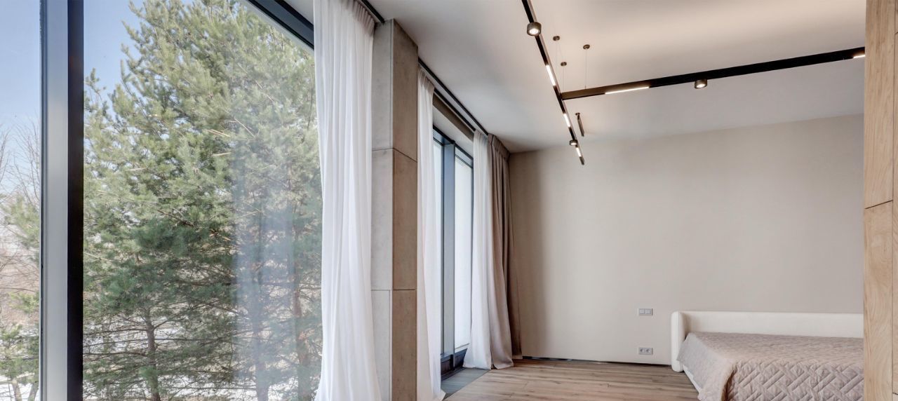 Невозможно не отметить потрясающие панорамные окна, сделанные на заказ и высоту потолков 4.5м