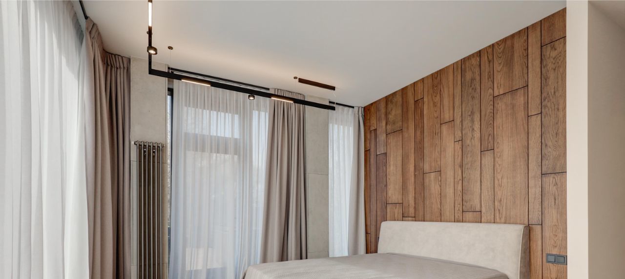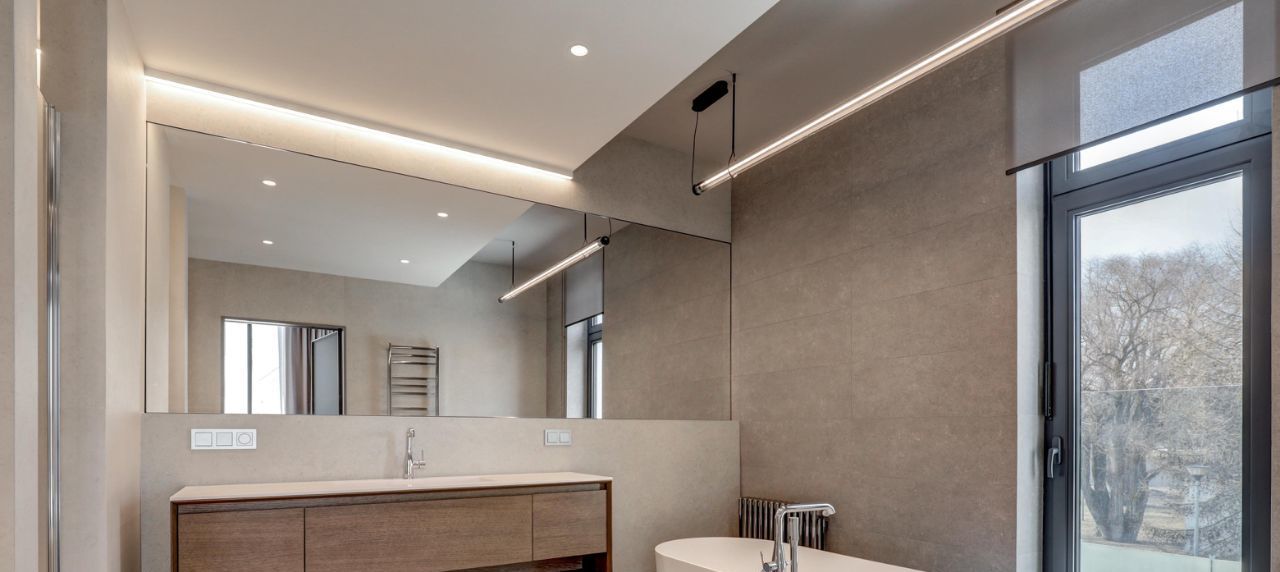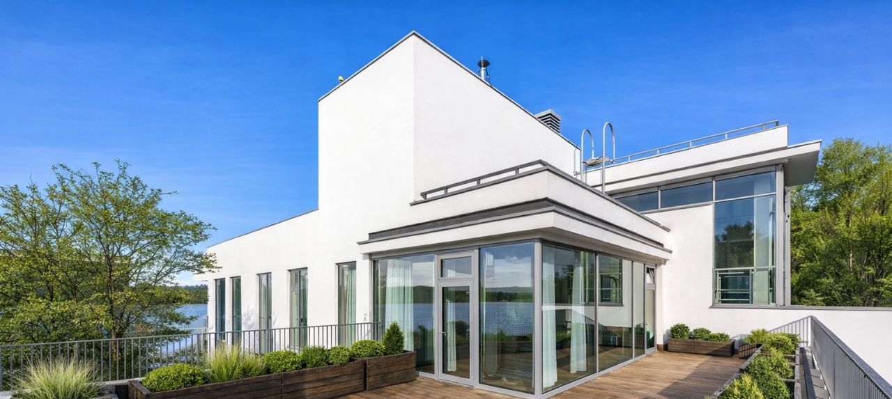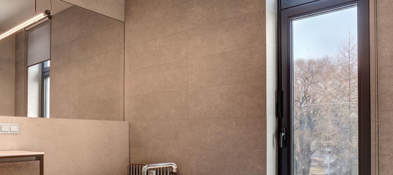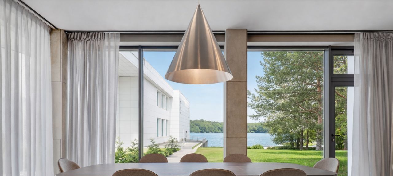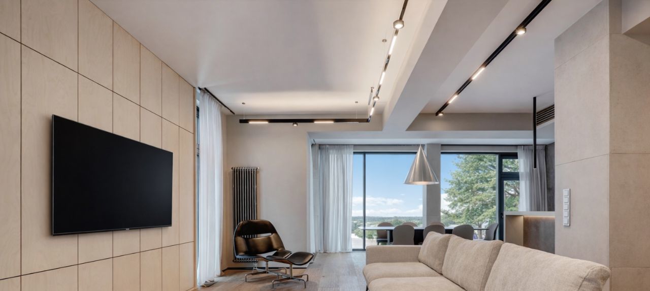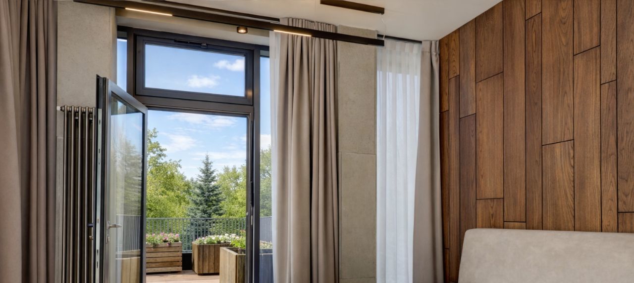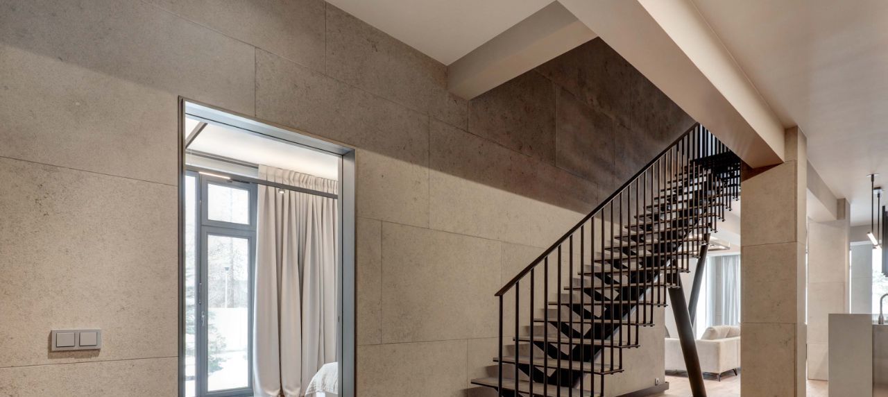 Невозможно не отметить потрясающие панорамные окна, сделанные на заказ и высоту потолков 4.5м