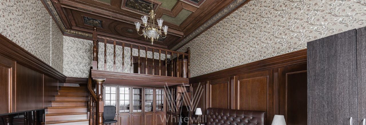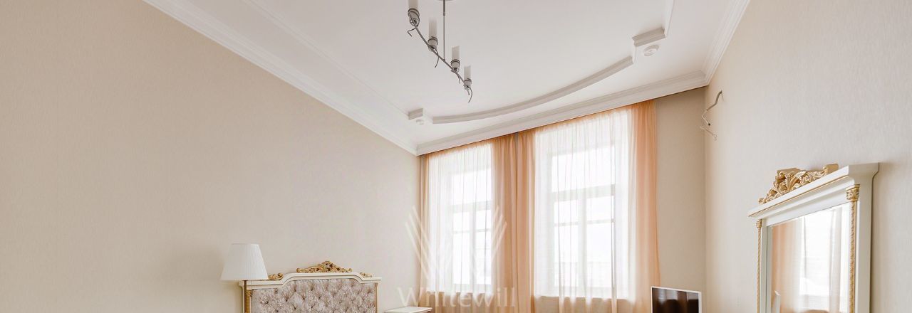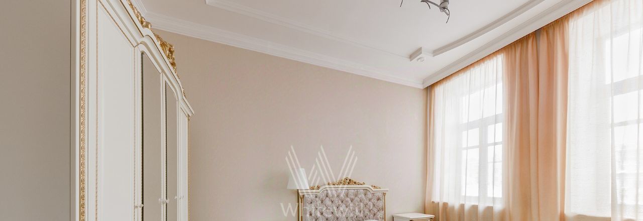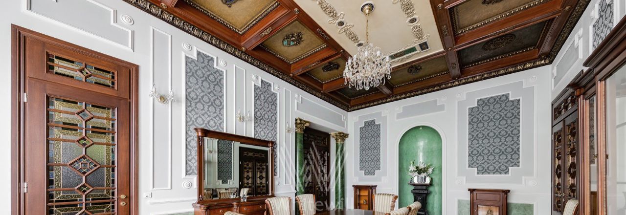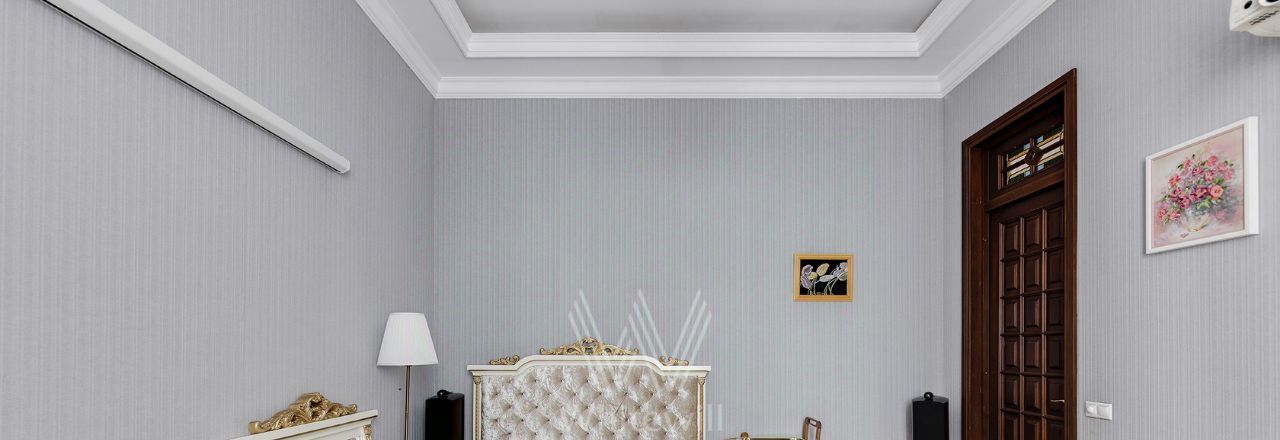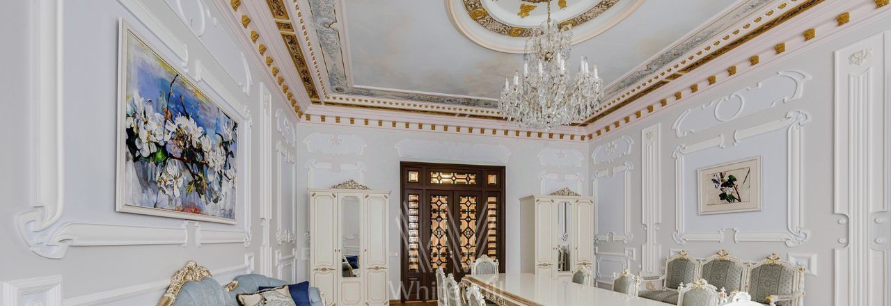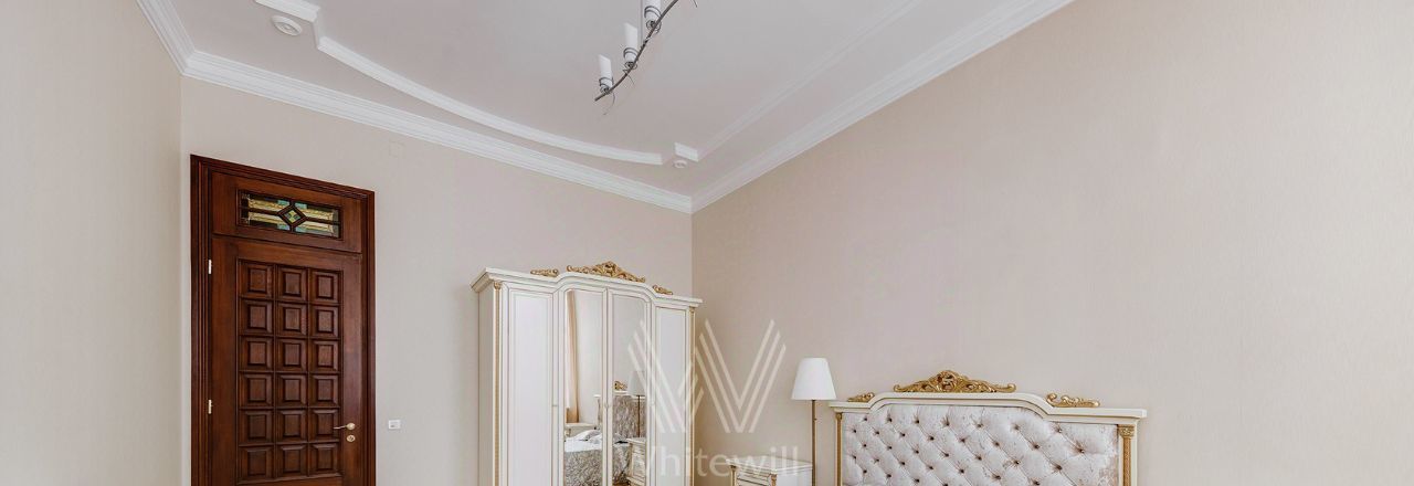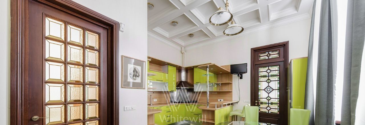 Просторная уютная квартира площадью 380 м² в особняке в центре Нового Арбата. Выполнена дизайнерская отделка, в интерьере сочетаются дворцовая классика и современный стиль. В отделке использовано натуральное дерево, паркет, светлая лепнина, кессоны на потолке. Высота потолков 4,5 метра.