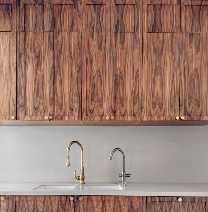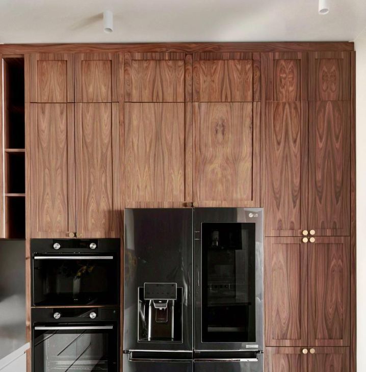 Интерьер выполнен в современной эстетике с акцентом на натуральные материалы и благородные фактуры: палисандр, орех, дуб, натуральный мрамор, качественный керамогранит, дорогая отделка и мебель, подобранная со вкусом.