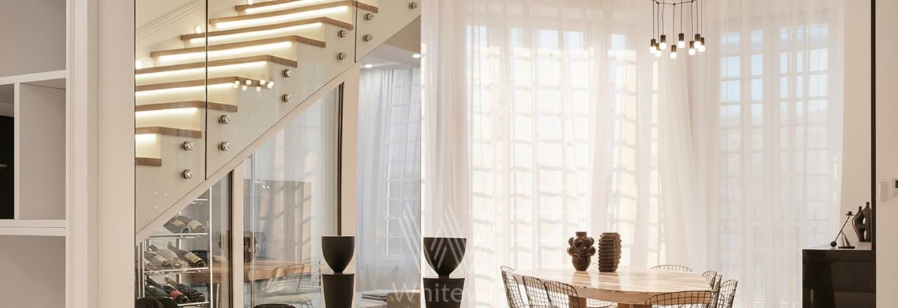 Бонус партнёрам 50%. Двухуровневый таунхаус общей площадью 620 м² в клубном комплексе делюкс-класса Knightsbridge Private Park в Хамовниках. Выполнена дизайнерская отделка в уникальном авторском стиле. Интерьер оформлен в светлых тонах и украшен картинами, скульптурами и подвесными светильниками. Благодаря панорамным окнам "в пол" и высоким потолкам пространство наполнено светом.