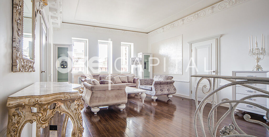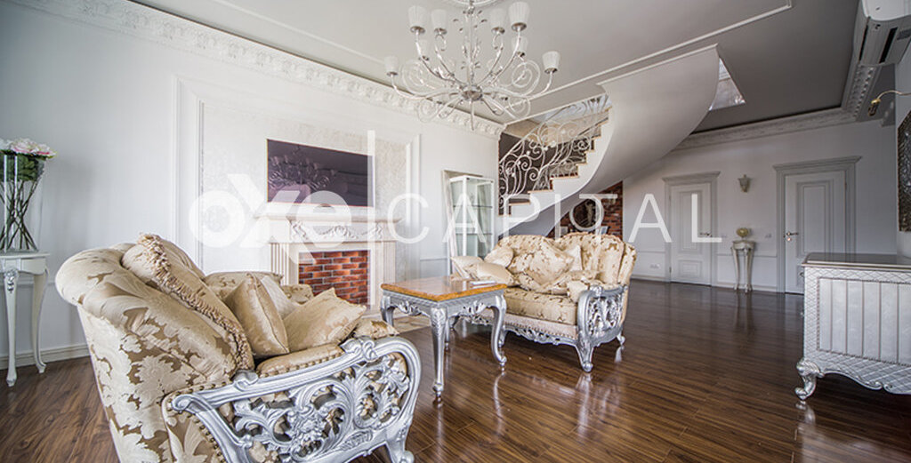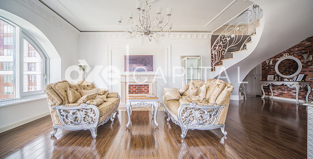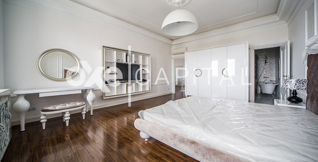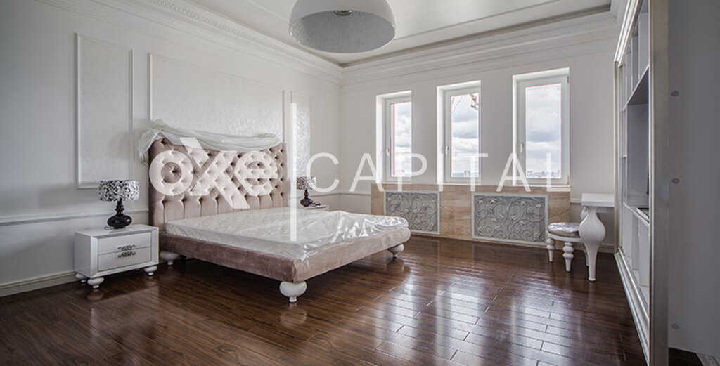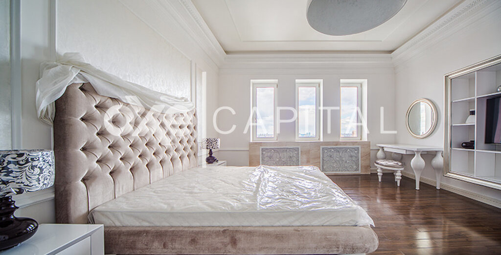 Лот №f39794 Стильная, с новым дорогим ремонтом, двухуровневая квартира. 1-ый уровень: кухня, гостиная-столовая, спальня с с /у, гардеробная, постирочная. 2-ой уровень: две спальни с с/у и гардеробными, комната свободного назначения(кабинет, детская, еще одна спальня), уютная диванная комната. Ремонт новый, никто не жил, стиль фьюжн. Очень дорогие отделочные материалы и мебель. Техника Mielle, люстры – богемское стекло, фарфор, пол - паркетная доска, мебель итальянская на заказ. Из окон потрясающие панорамные виды на Москву.