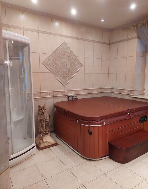 Таунхауз представляет собой капитальное трехэтажное строение. На первом этаже расположены входная зона, зона отдыха с большой ванной-джакузи, сауной, постирочной, бойлерной. С этажа есть выход в закрытый гараж и на террасу с камином.