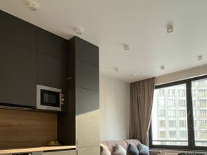 Новый ремонт и минималистичный интерьер создают комфортное, хорошо организованное пространство. Кухня совмещена с гостиной, здесь же - выход на балкон. В квартире 2 санузла.