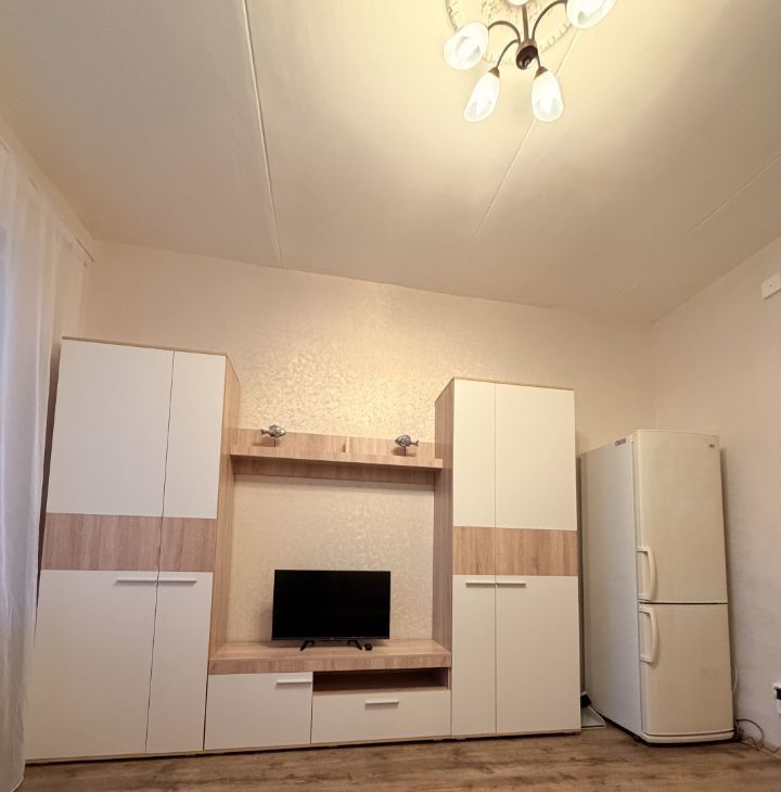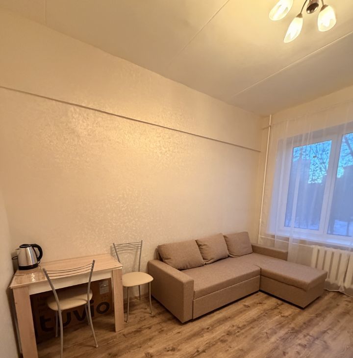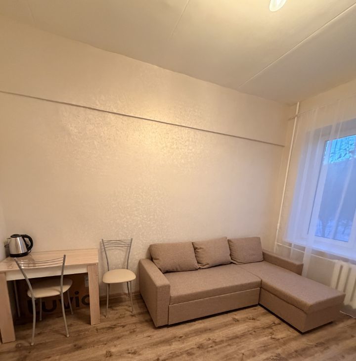 Комната полностью укомплектована и готова для комфортного проживания. Есть новый раскладной диван, современная мебельная стенка с большим количеством мест хранения, холодильник, телевизор со Smart TV, стол и стулья, электрический чайник. Проведен Wi-Fi, установлены пластиковые окна. Высокие потолки (3 м) делают комнату более просторной и светлой.