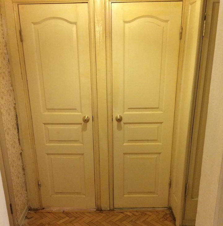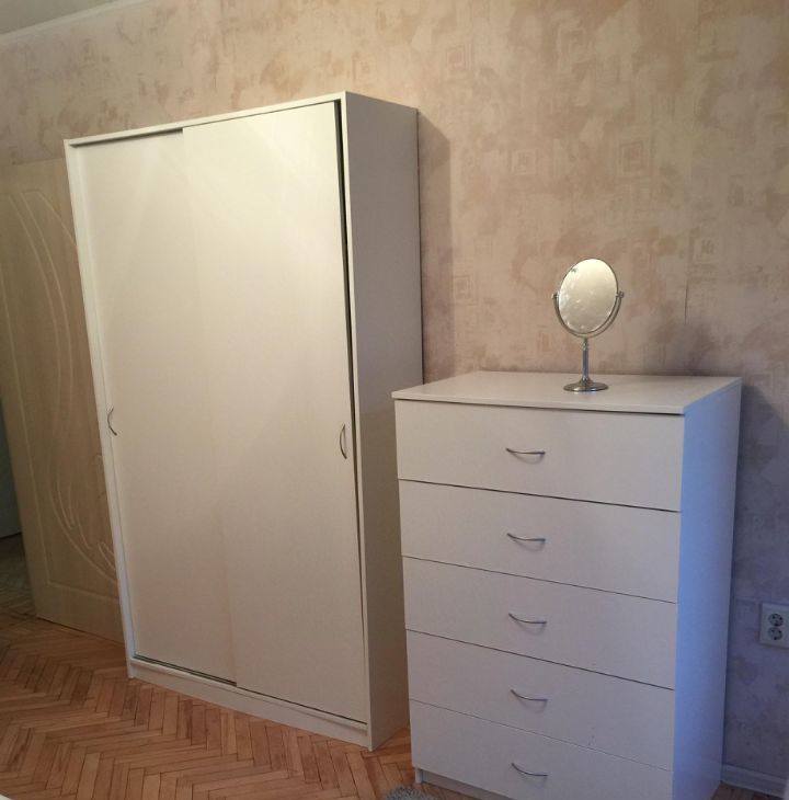 В реальности в комнате уже новый белый шкаф и белый комод икея ( немного другой), кровать та же. Присутствуют потертости на паркете.