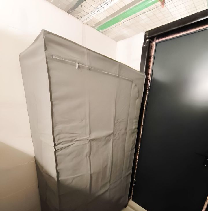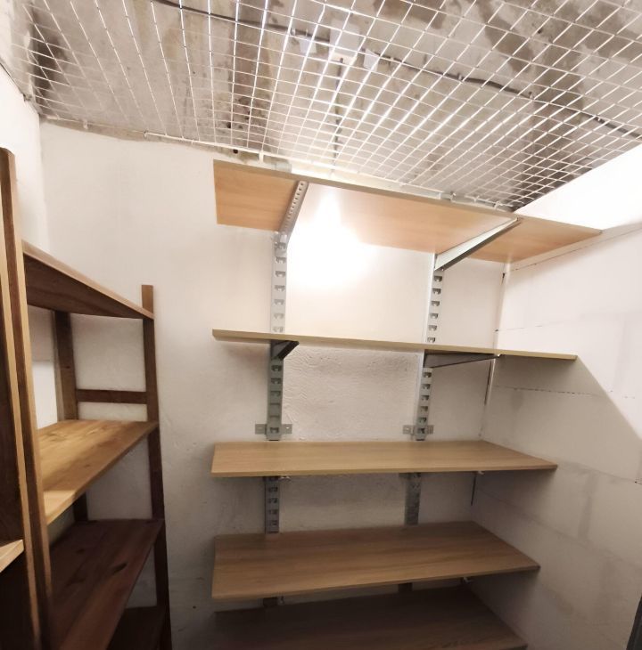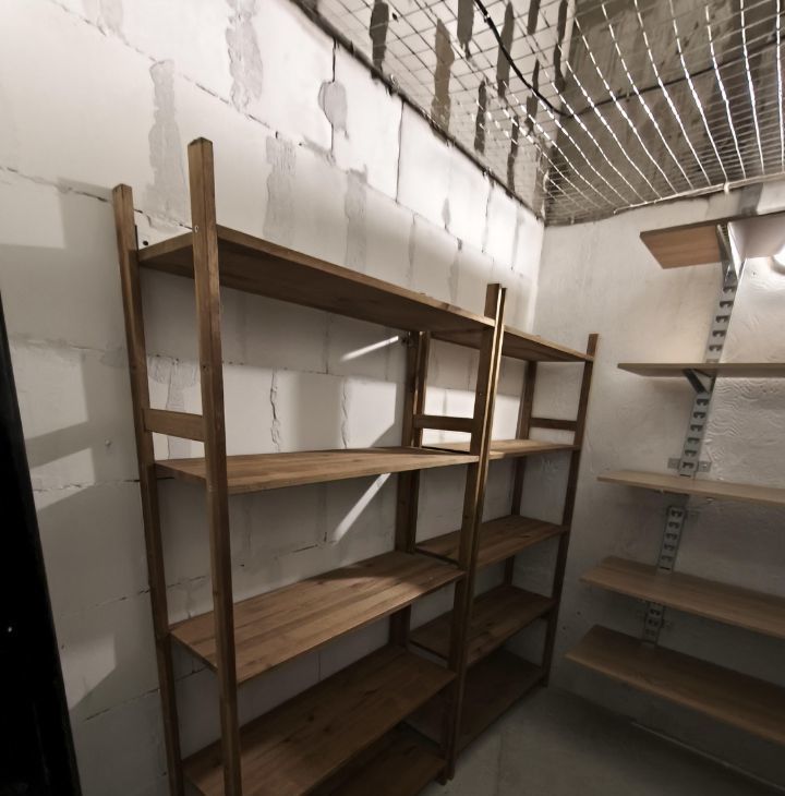 Для хранения два стеллажа (50 кг на полку), навесная система с шириной полок 1,2м (200 кг на полку), шкаф-чехол для одежды с полками и перекладиной.
