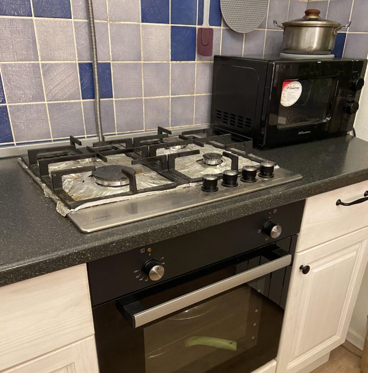 На кухне: Газовая плита, холодильник, электрический чайник, микроволновка, духовка, посуда.