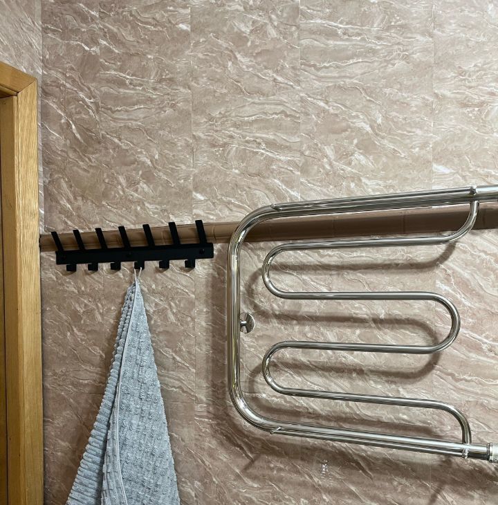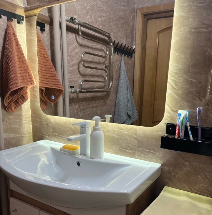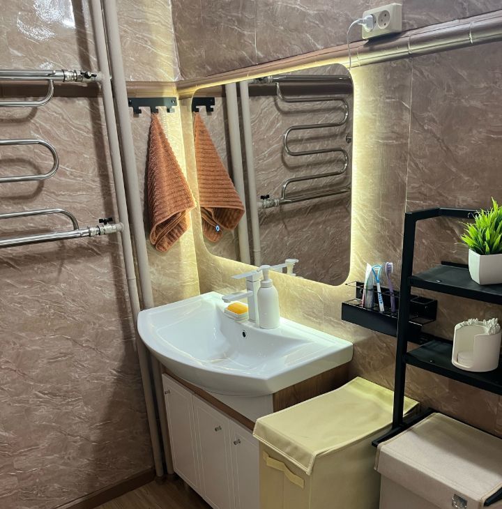 В ванной комнате предусмотрены отделные полочки для банных принадлежностей, а также корзины для белья.