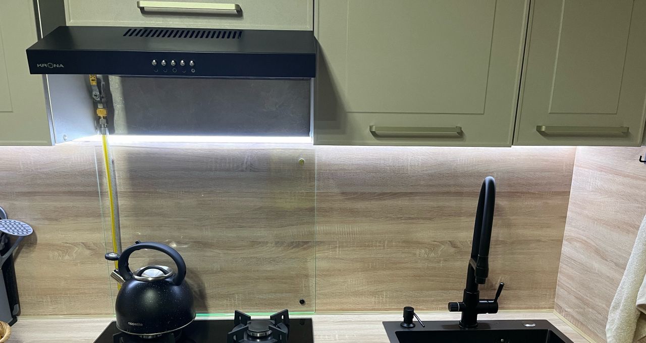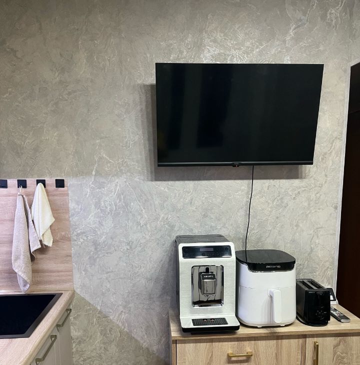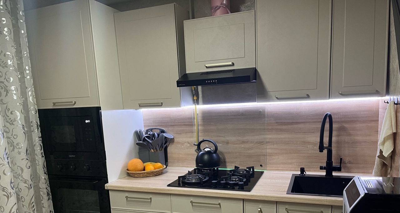 Для приготовления вкусных блюд кухня полностью укомплектована: духовой шкаф, микроволновка, аэрогриль, газовая варочная панель, холодильник, тостер, мультиварка, кофемашина.