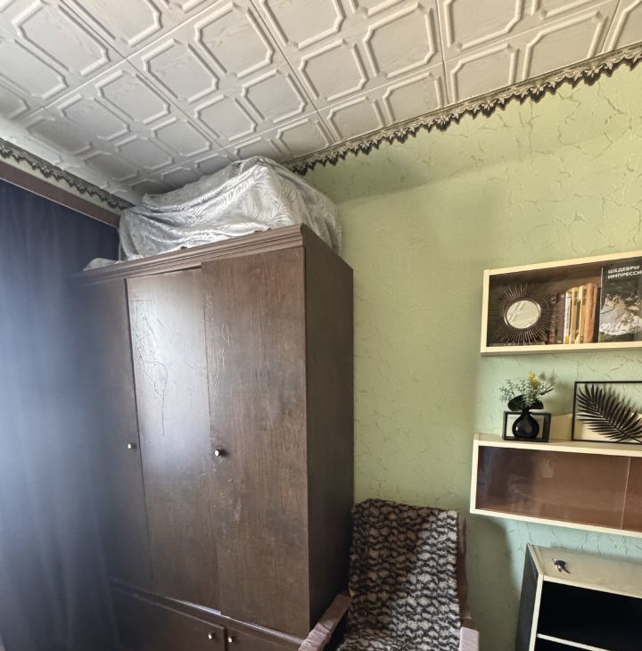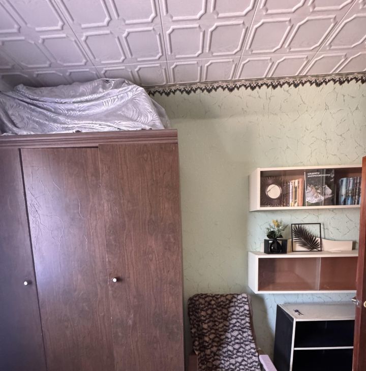 комната чистая, аккуратная, с необходимым набором мебели (диванчик, шкаф, полки, стол).