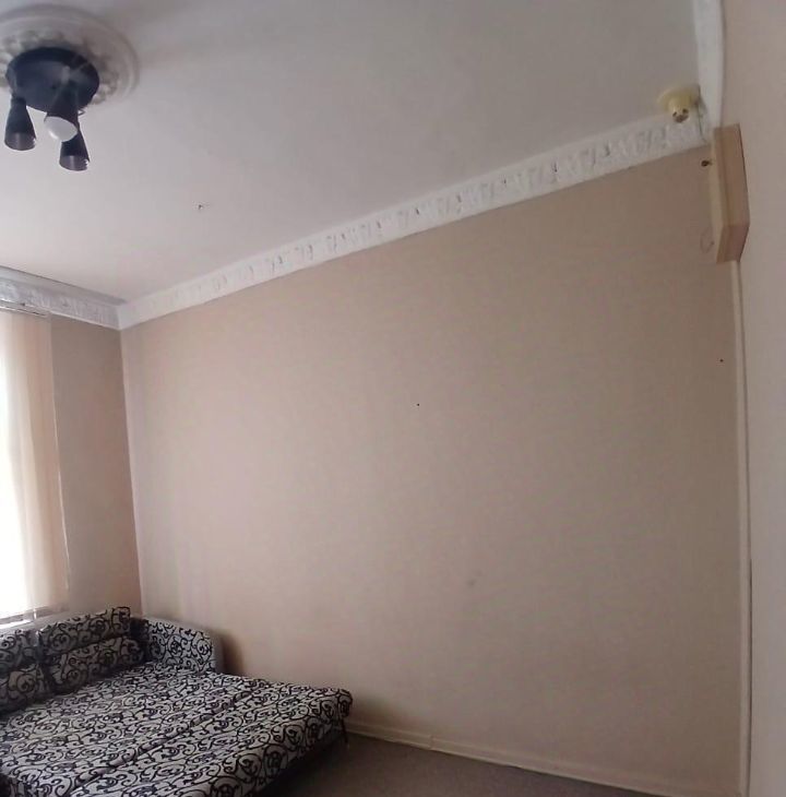 В комнате; диван, но заменим на кровать, шкаф, стол, потолки три метра.