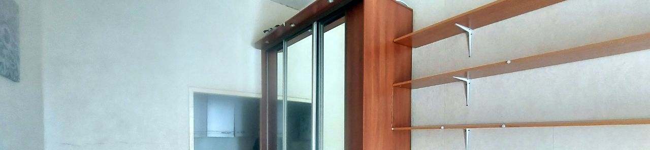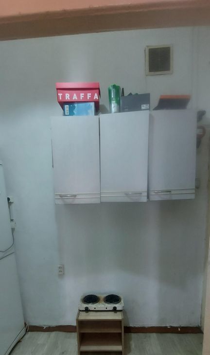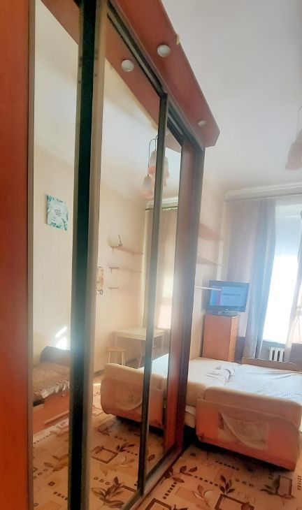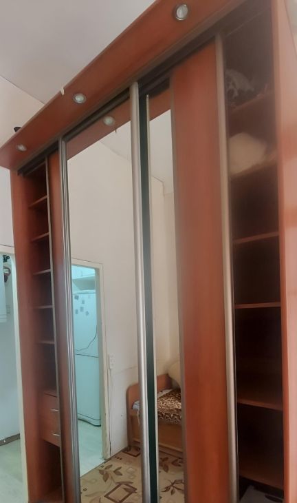 В комнате: телевизор, зеркальный большой шкаф-купе, диван еврокнижка, кровать, стол. Всё чистенько и красиво. Есть небольшая личная кухня -холодильник, кухонный стол, навесные шкафы для посуды и мелочей.