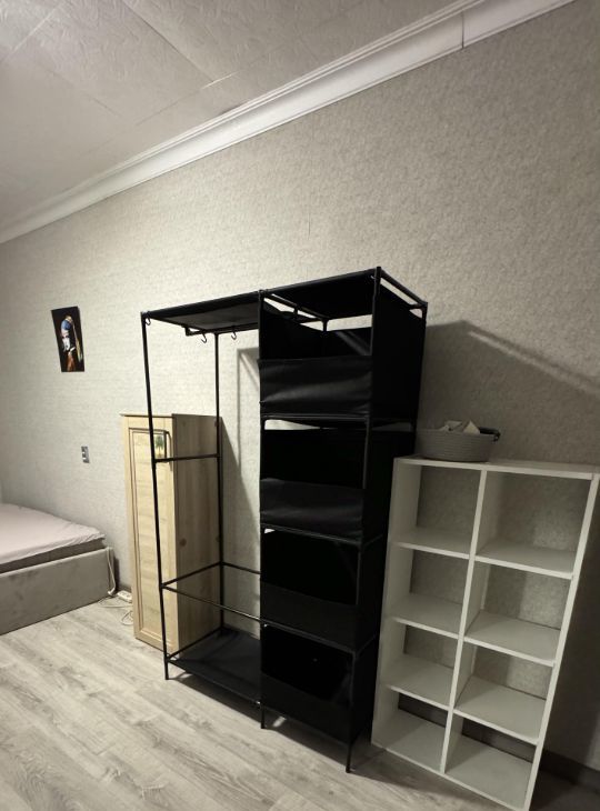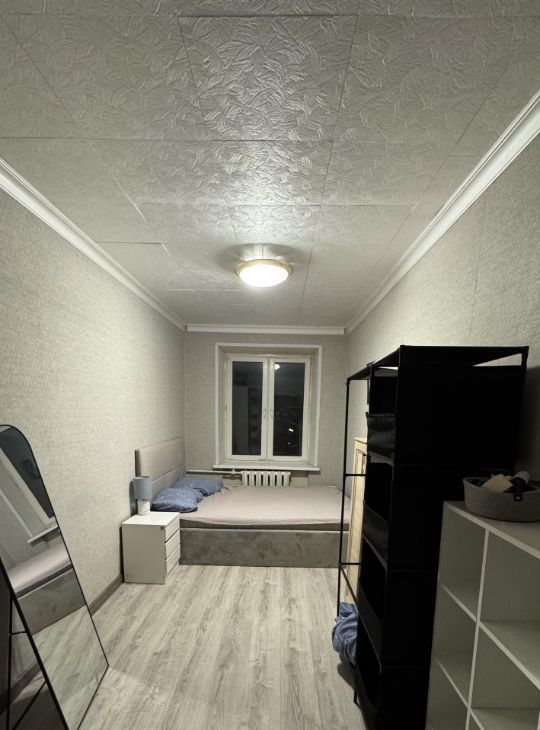 Комната 12 м², полностью готова к проживанию: большая кровать с удобным ортопедическим матрасом, угловой шкаф, тумбы, стеллаж, напольное зеркало. При необходимости можно изменить расстановку мебели и поставить рабочий стол.