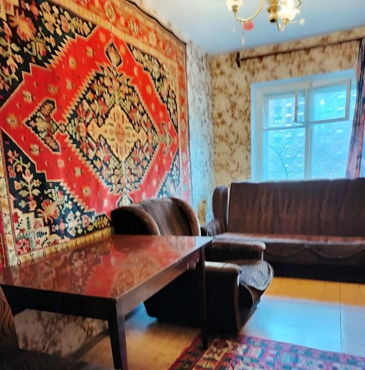 Изолированная комната, 14 кв м, в комнате диван, 2 кресла, шкаф, стол, сервант, телевизор. Стиральная машинка в ванной, холодильник на кухне.