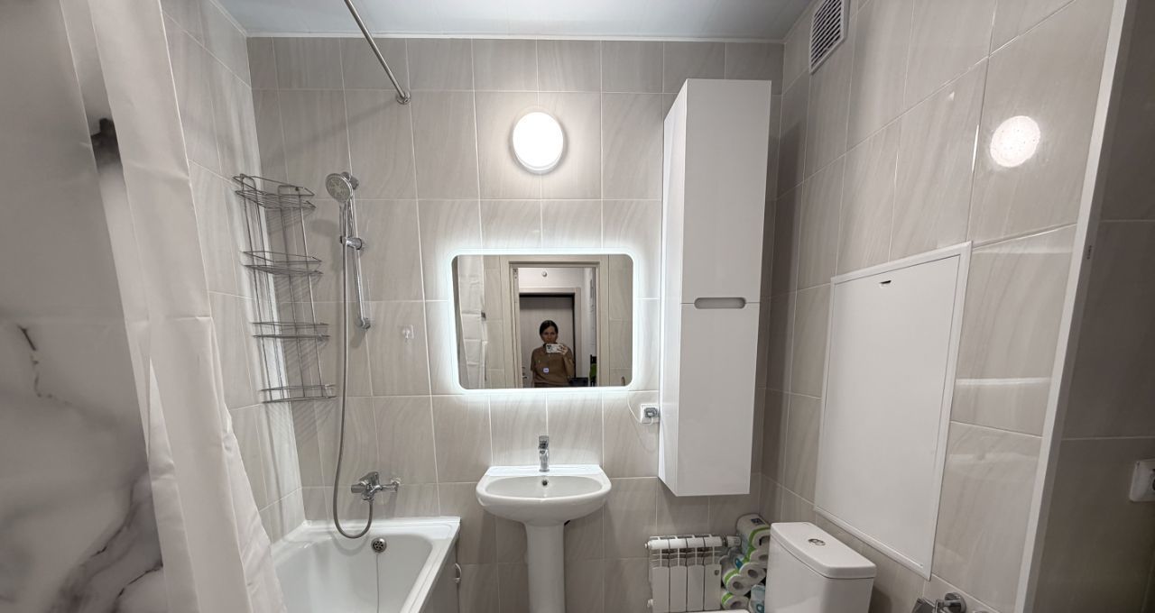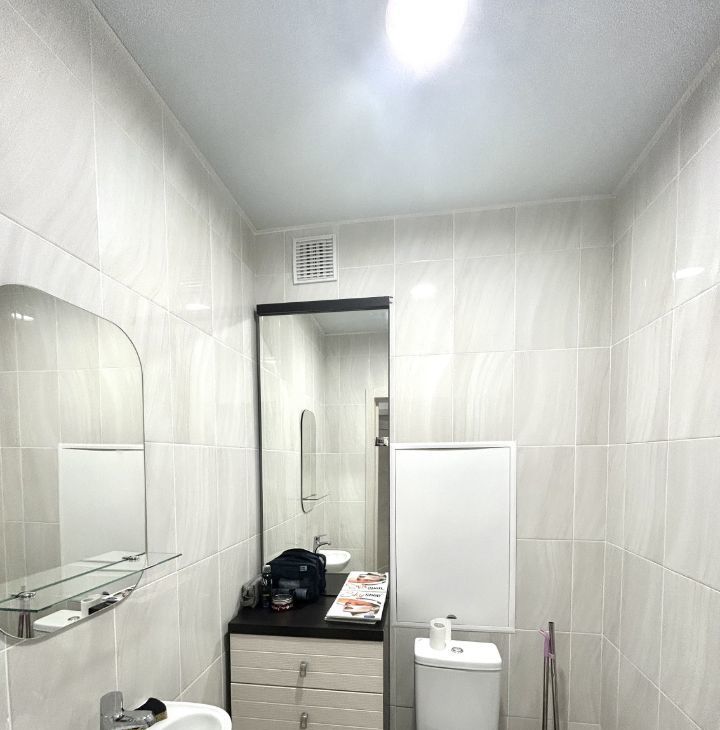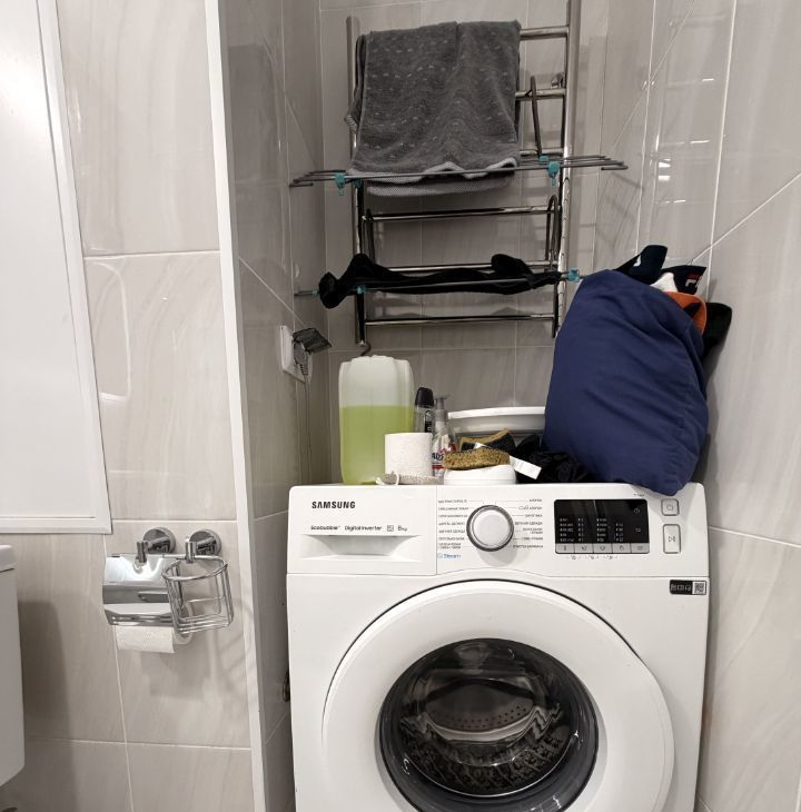 Новая стиральная машинка Samsung на 8 кг с режимом быстрой стирки 15 минут! В главной ванной зеркало с димером и подсветкой, подвесной пенал. Во втором санузле комод с зеркалом, зеркало с полкой, напольная сушка для одежды, гладильная доска, утюг, инвентарь для уборки.