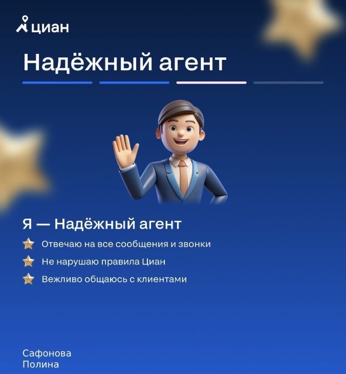Хорошая услуга «Личный помощник». За вами закрепляют менеджера, который подбирает для вас варианты, помогает с подписанием договора и проверкой квартиры. Константин оперативно отвечал на наши вопросы и подстраивался под возникающие в ходе поиска требования.