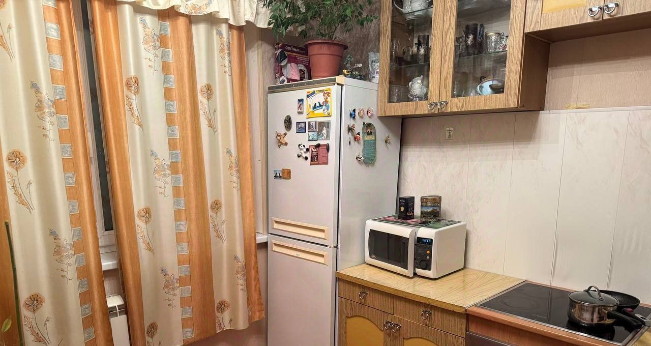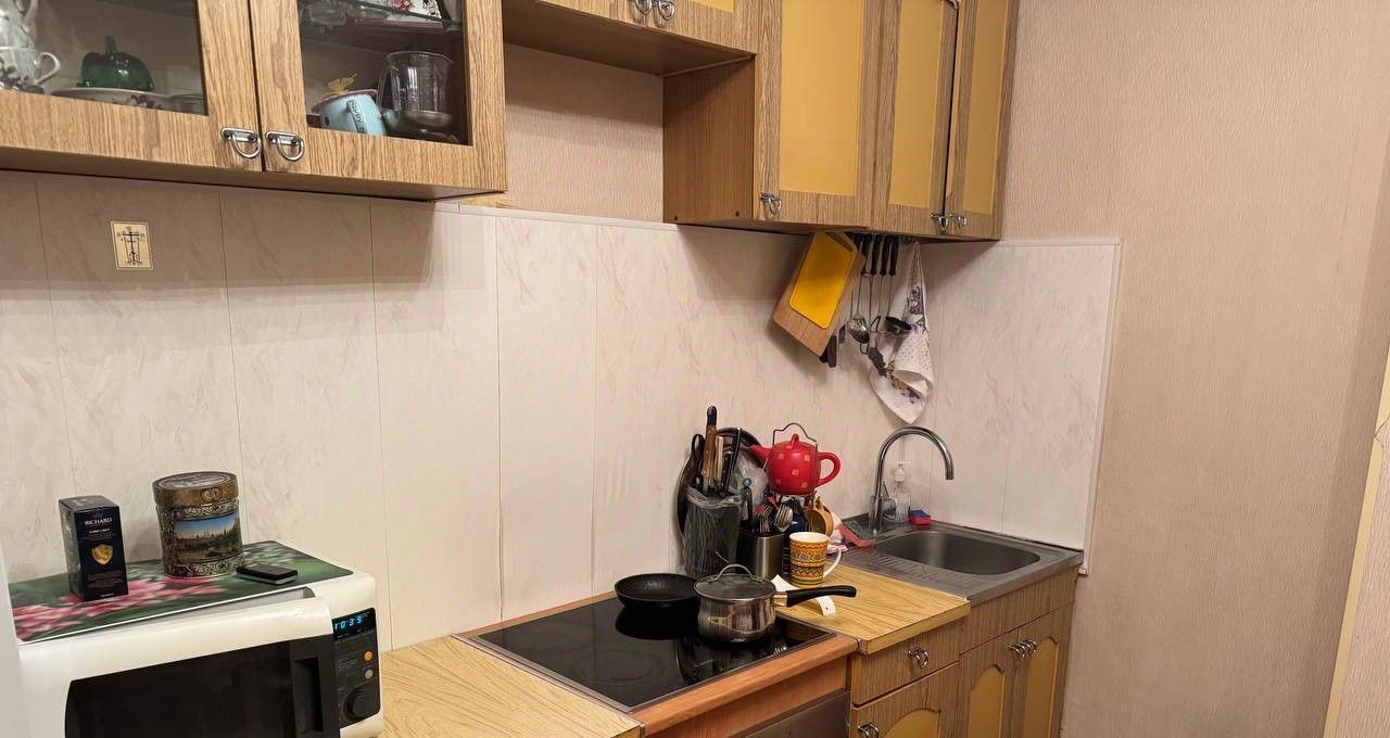 Кухонный гарнитур,вся необходимая бытовая техника(плита,холодильник,микроволновая печь,стиральная машина).СУ-раздельный,плитка.