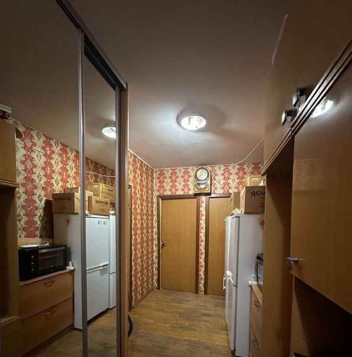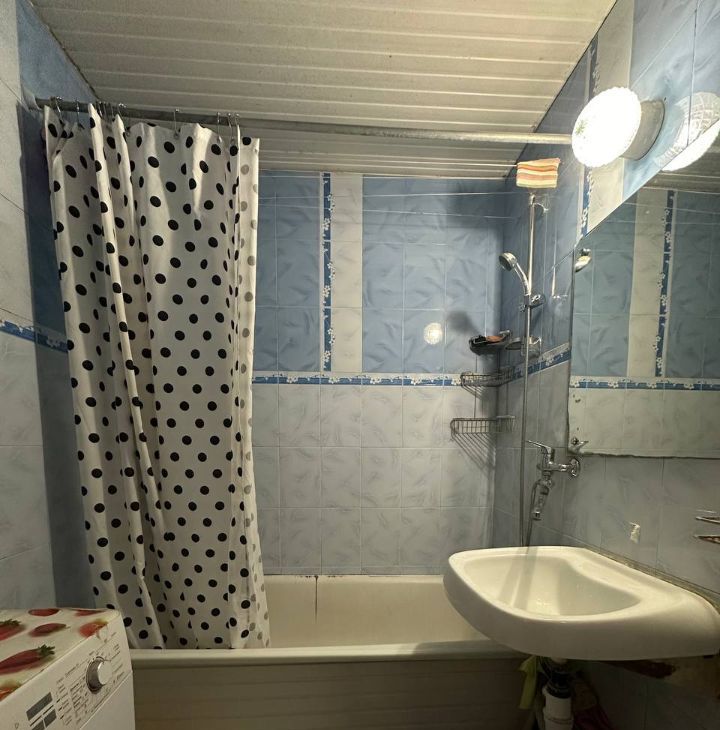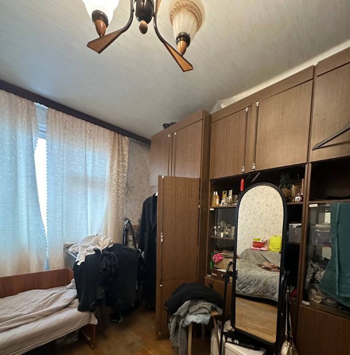 Сама квартира в хорошем состоянии и со всеми удобствами, а эта единственна комната без ремонта, но в ней все равно достаточно уютно и светло: имеется кровать и диван, а также большая стенка. Зеркала и вещей, как на фото — не будет. В коридоре тоже много шкафчиков для вашего пользования. Комната запирается на ключ.