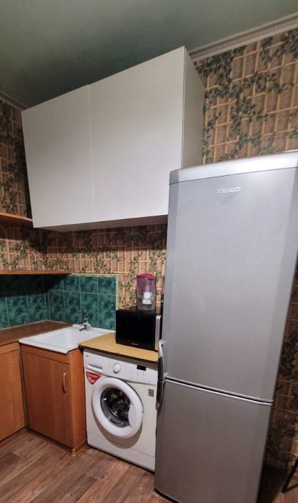 Комната после ремонта без мебели, большая, светлая, имеется балкон. На кухне стол, стулья, холодильник, стиральная машина, чайник, микроволновка.