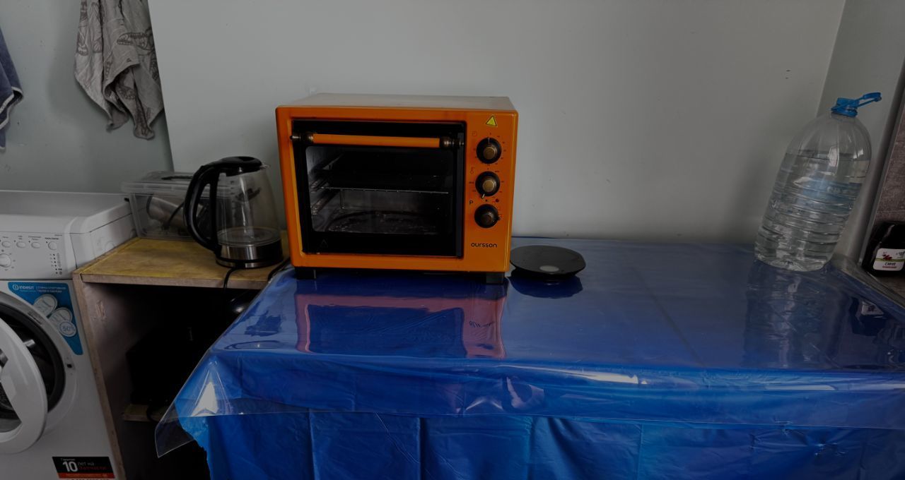 кухня: две индукционные электроплиты, духовка, стеллажи, стиральная машина.