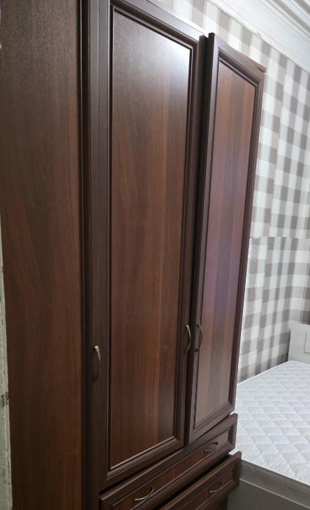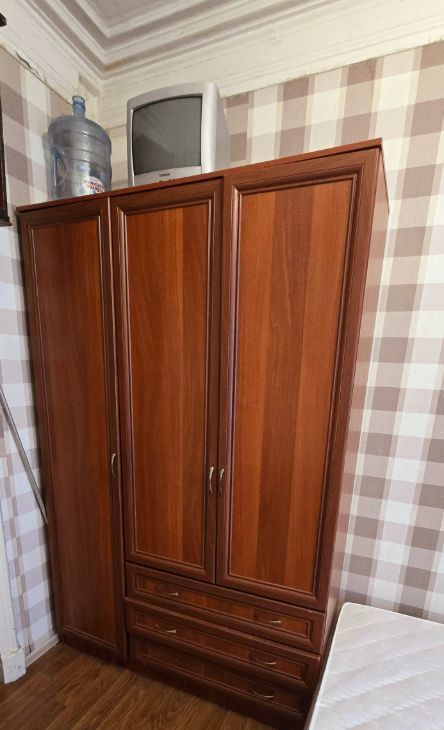 В комнате новая кровать 140200, стол , две штуки табуретки, холодильник, шкаф. Полка навесная на стенке.
