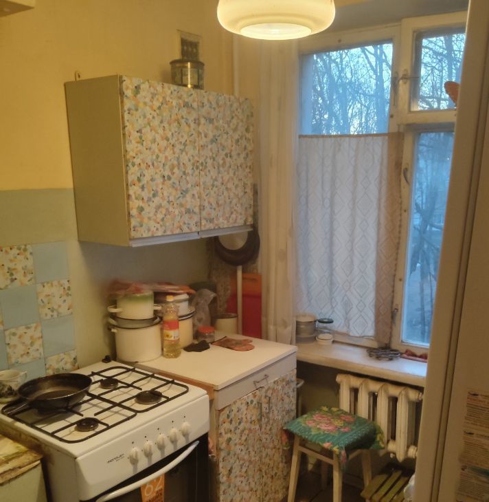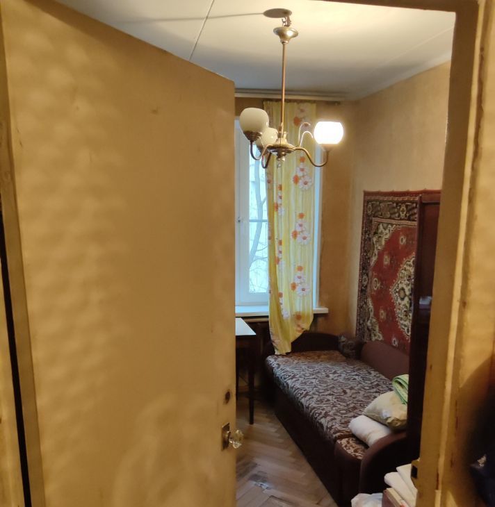 "Хрущёвка" без ремонта. Во второй комнате мужчина 50 лет и кошка.