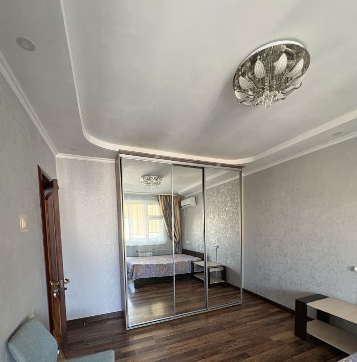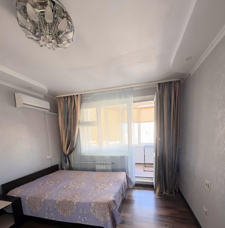 Комната очень большая и наполнена естественным светом. Из неё есть выход на закрытый балкон, где можно обустроить уютную зону отдыха или рабочее место. В комнате установлен кондиционер, есть большая удобная кровать и вместительный застеклённый шкаф для хранения вещей.