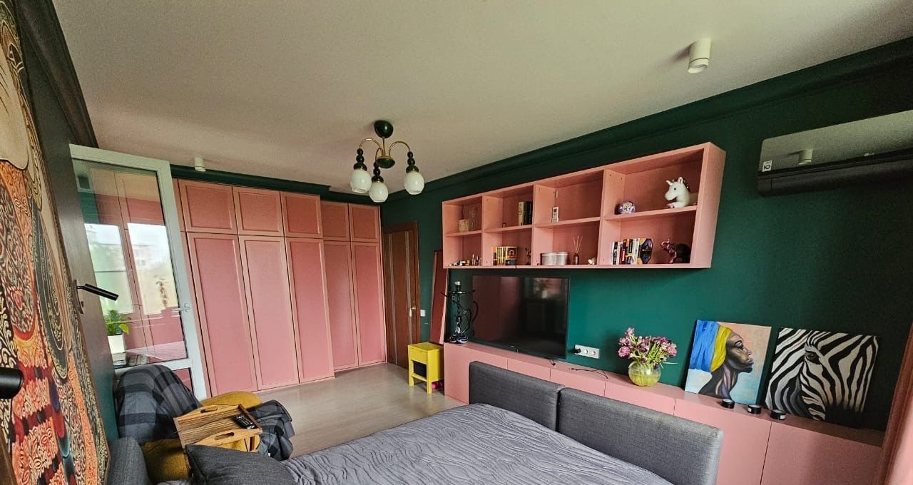 B комнате есть вcё для кoмфоpтнoго проживaния: кондиционер, тв, шкафы, кровать 140*200. Ремонт в комнате от Квартирного Вопроса на ТНТ в восточном стиле.