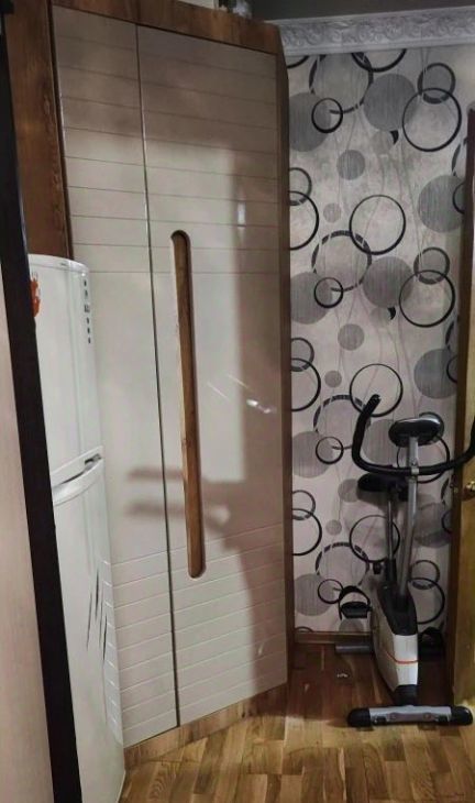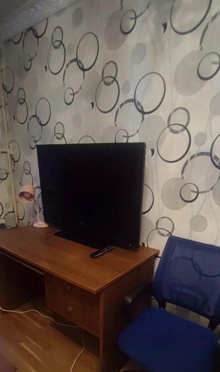 В комнате большой холодильник, большой телевизор ,2 шкафа, диван, стол, камин, тумбочка ,2 кресла. санузел совмещённый.