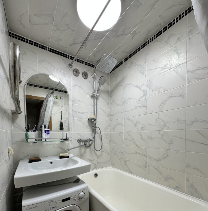 В квартире есть все для комфортного проживания - стиральная машина, холодильник, телевизор в комнате, удобная кровать и просторная, застекленная лоджия.